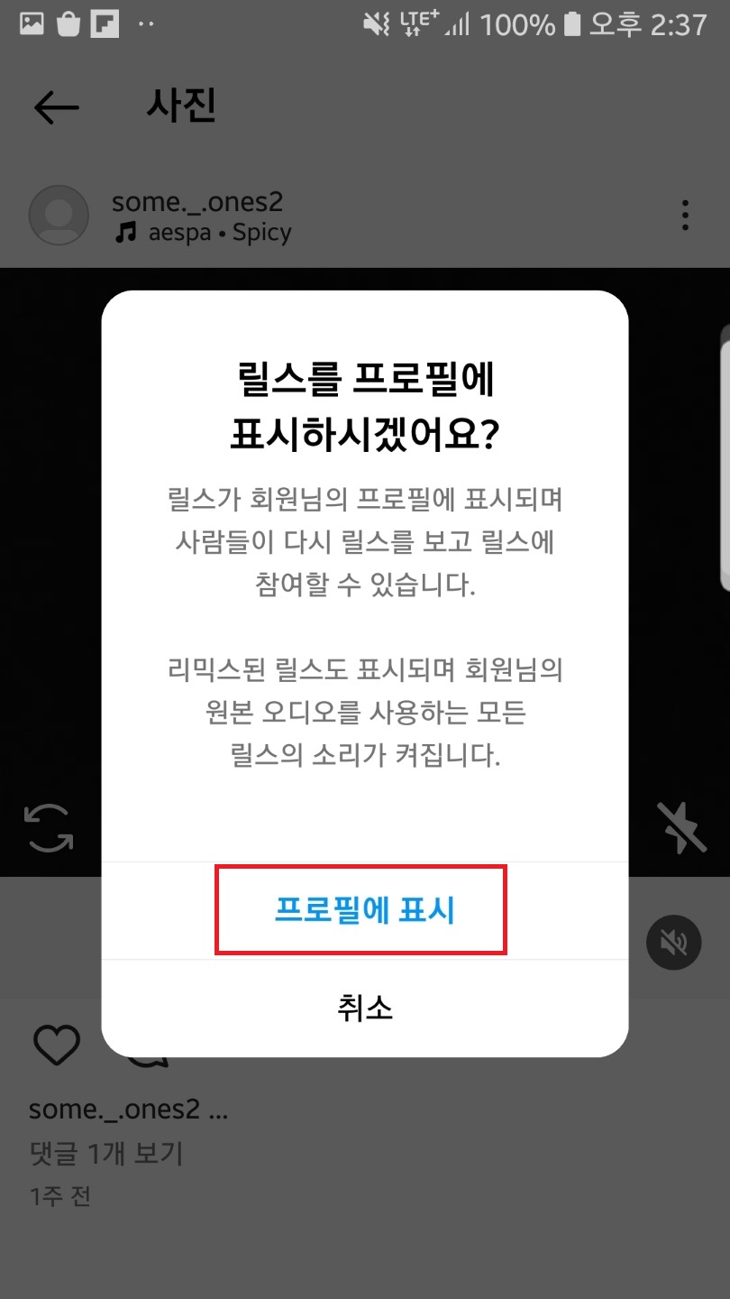 프로필에 표시를 눌러주시고 후에 뜨는 팝업창에서도 프로필에 표시를 눌러주신 후 피드로 돌아가보시면 다시 생긴 게 보이실 거예요!