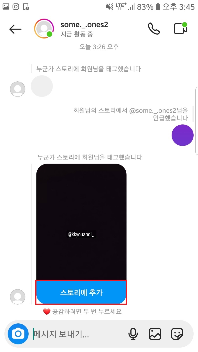 스토리 언급된 메세지 클릭▶스토리에 추가