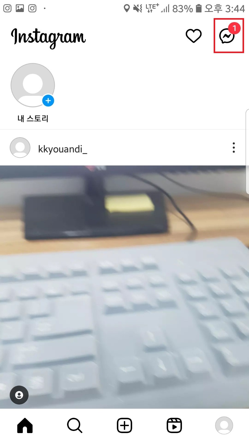 인스타 어플을 실행해주신 후 우측 상단 메세지 아이콘을 클릭하여 디엠창을 열어주세요.
