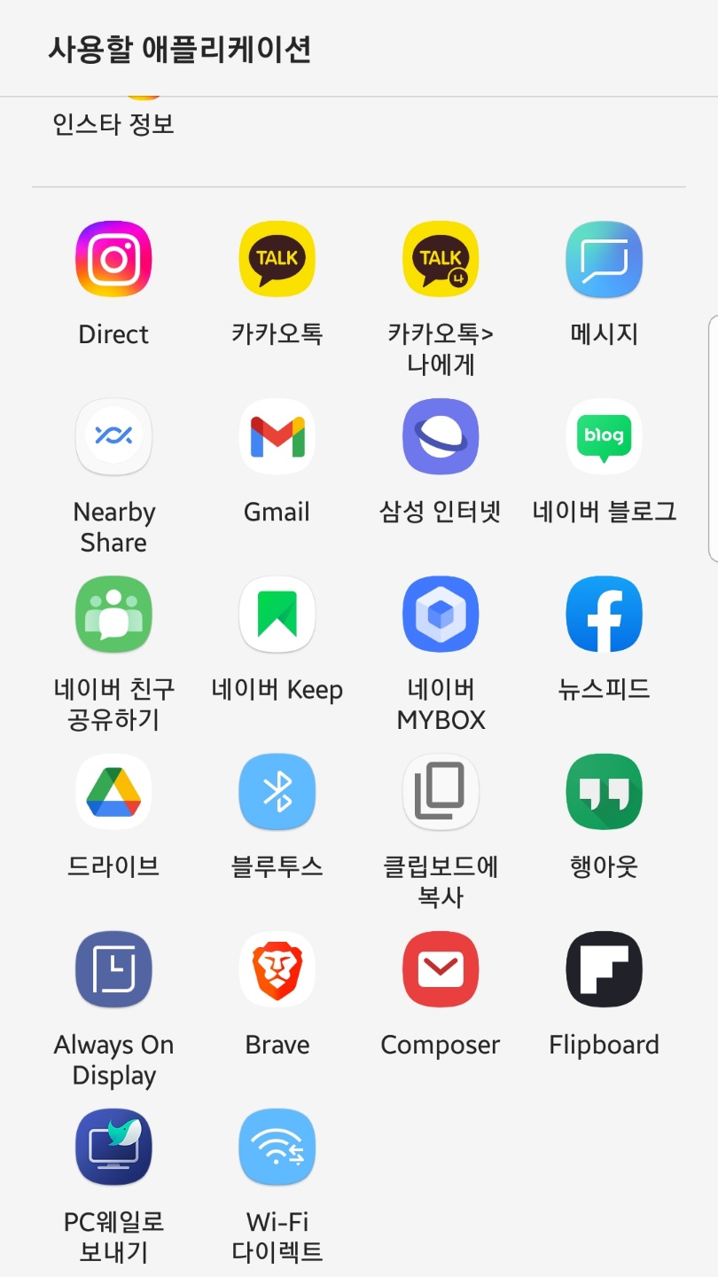 어플이 뜨는 화면을 위로 올려 전체 앱을 보시고 공유하기를 사용할 어플을 선택해주시면 된답니다!