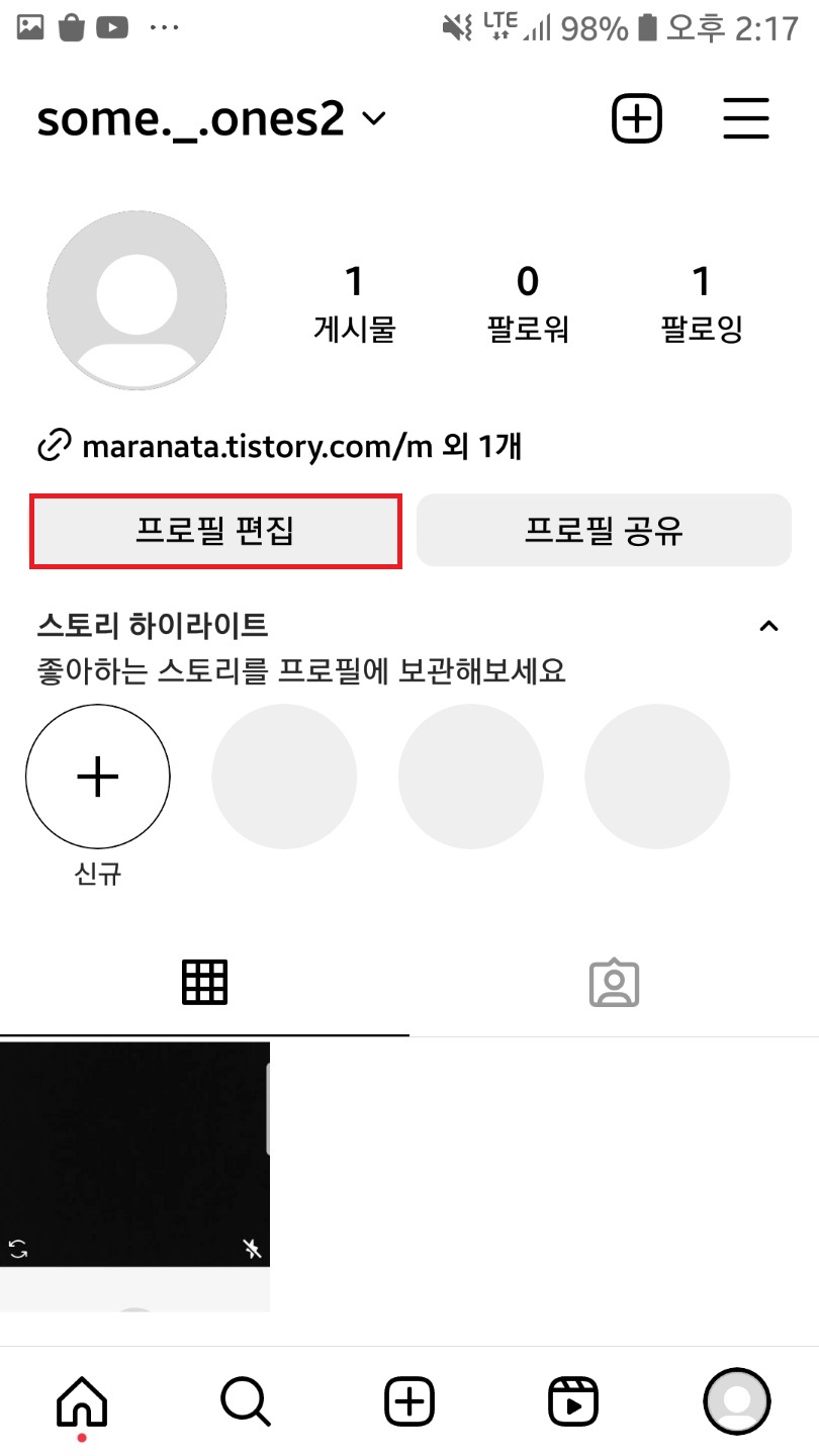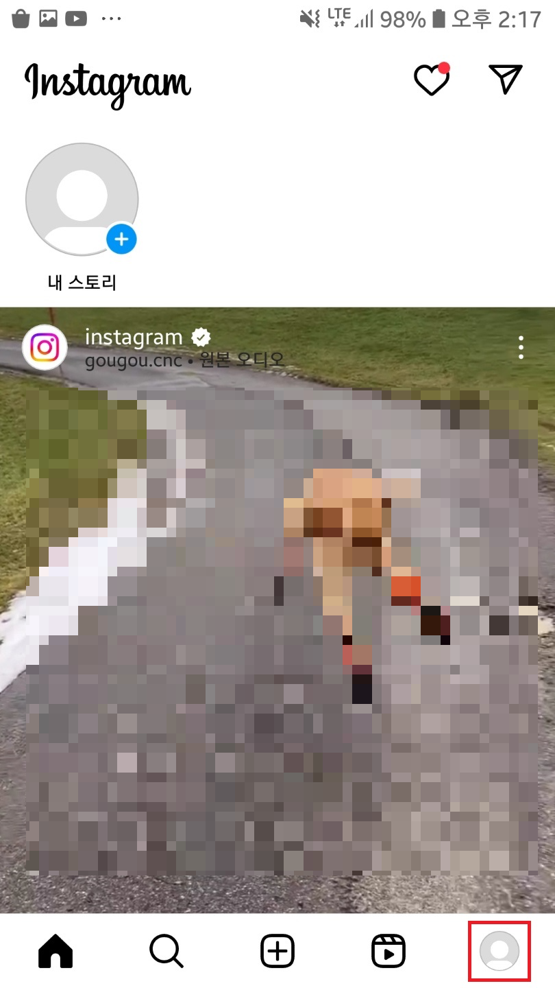 인스타 어플을 실행해주시고 우측 하단 프로필을 클릭해서 내 피드에 들어가주세요.