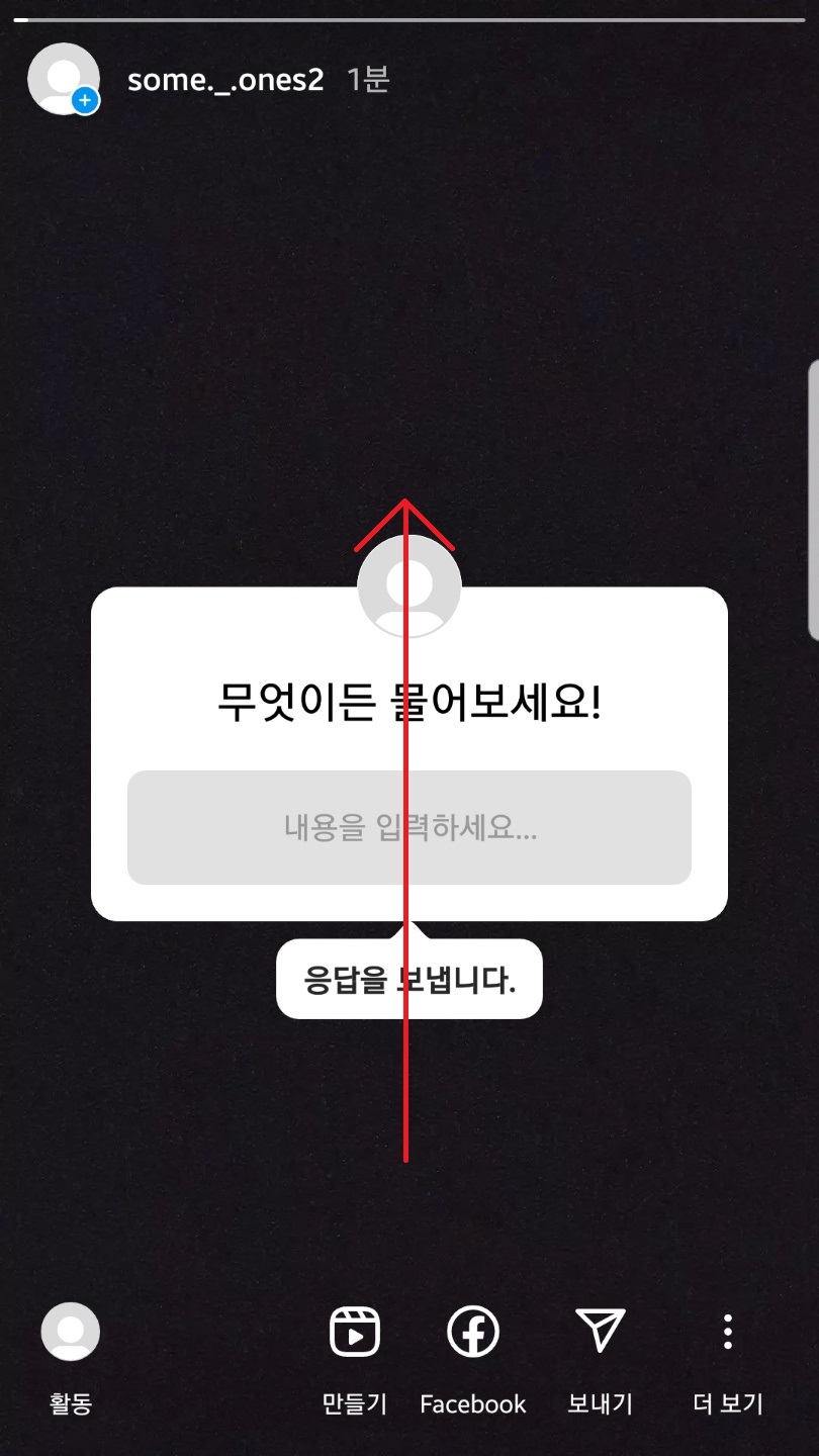 만약 질문이 온다면 답장하는 방법도 알려드릴게요. 내 스토리로 들어가서 무엇이든 물어보세요 스토리에서 화면을 위로 스크롤하시면 '응답'이라고 되어있는 탭에 질문 목록이 뜨는데요. 여기서 원하는 질문 밑 답하기를 눌러주세요.