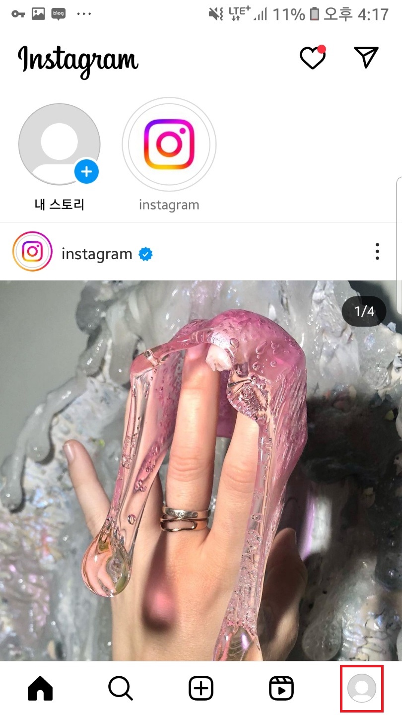 인스타 어플을 실행하시고 우측하단 프로필을 클릭해서 내 피드에 들어가주세요!