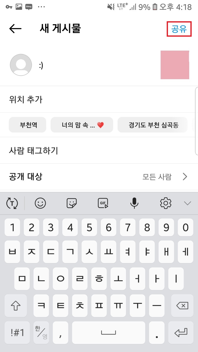 상단에 문구 입력을 클릭해서 게시물과 함께 올릴 내용을 입력해주시고 우측 상단 공유를 클릭해주세요!