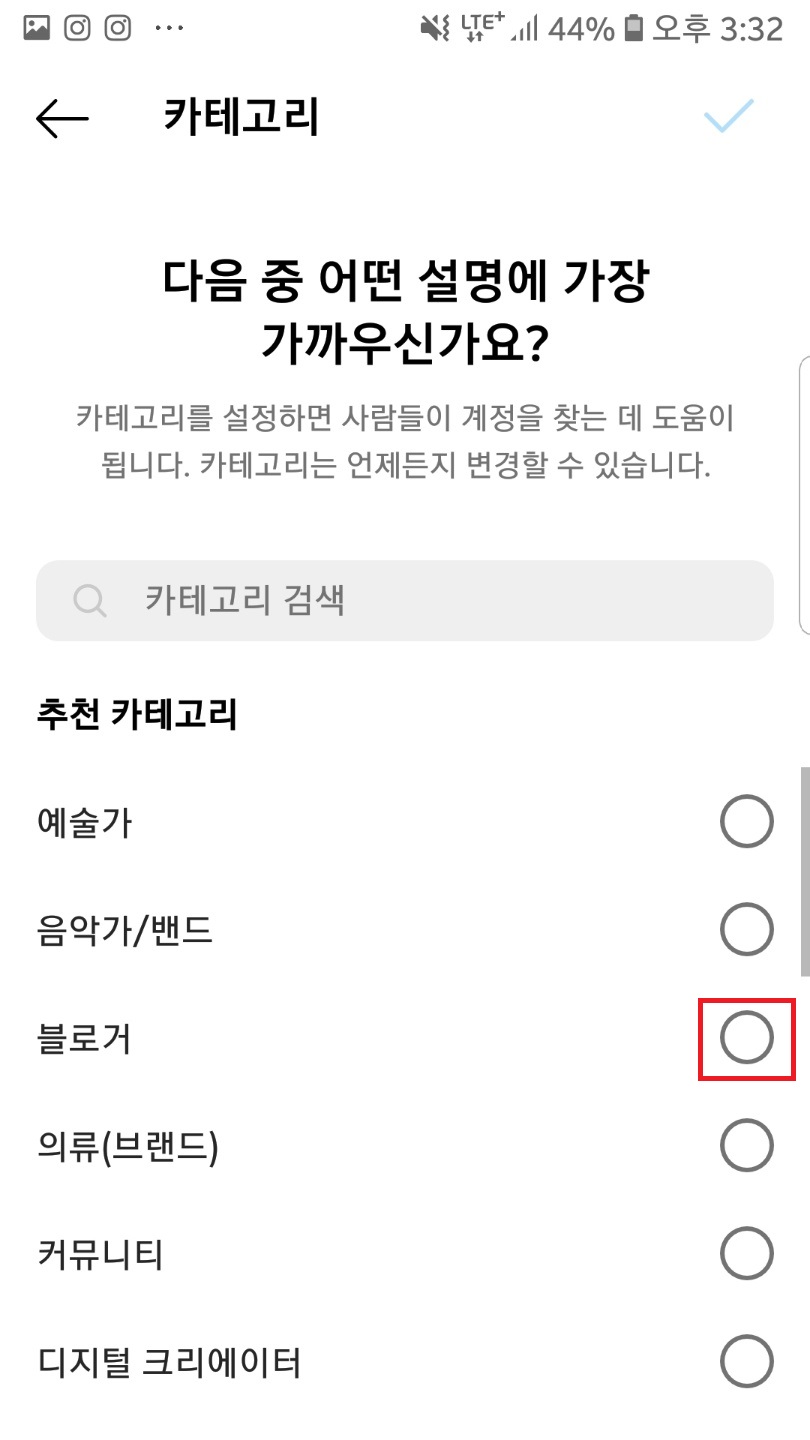 크리에이터와 비즈니스 계정 중에 선택하시고 다음을 누른 후 X를 눌러주시면 직업 추가가 된 걸 보실 수 있어요!