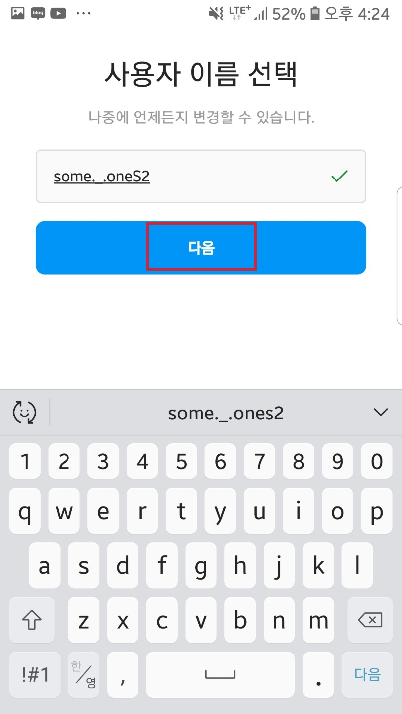 사용자 이름칸을 선택한 후 사용하실 이름을 입력하고 다음을 눌러주세요.
