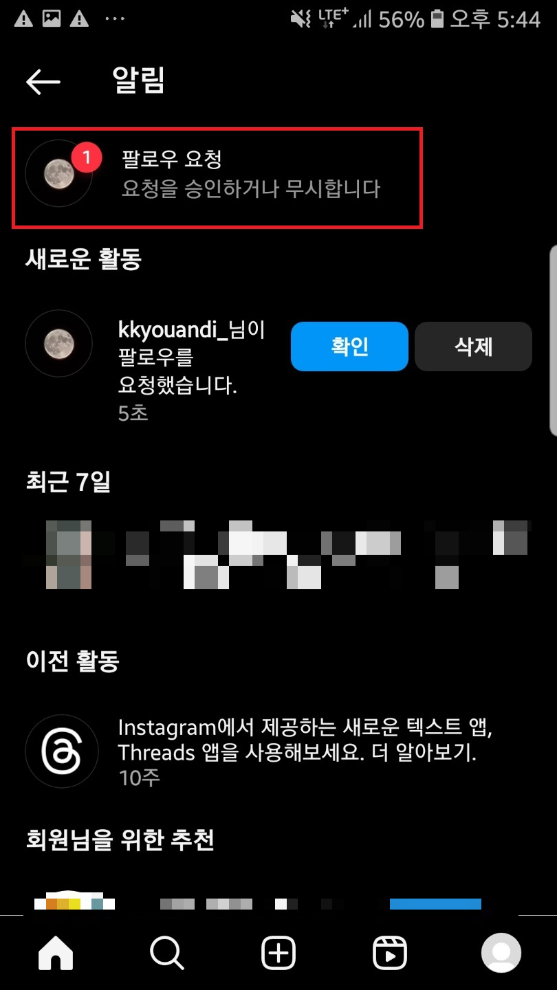 비공개 계정일 경우 누군가 나에게 팔로우를 걸면, 내가 요청을 승인할 때까지 내 계정 공개가 제한돼요. 이 팔로우 요청은 우측 상단 하트 아이콘에서 확인할 수 있으니 참고하세요~!