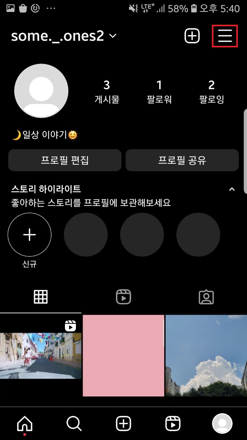 인스타 어플을 실행하신 후 우측 하단 프로필을 클릭하여 내 피드로 들어가주세요.