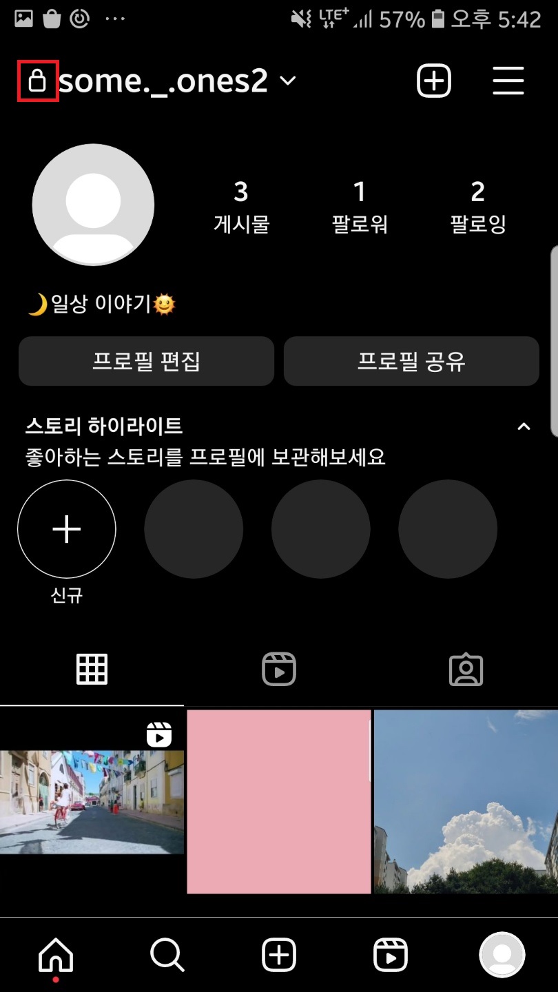 다시 피드로 돌아가보면 계정 이름 옆에 자물쇠 아이콘이 걸린 것을 확인할 수 있는데요. 이렇게 되면 비공개 계정으로 전환이 완료된 거랍니다!