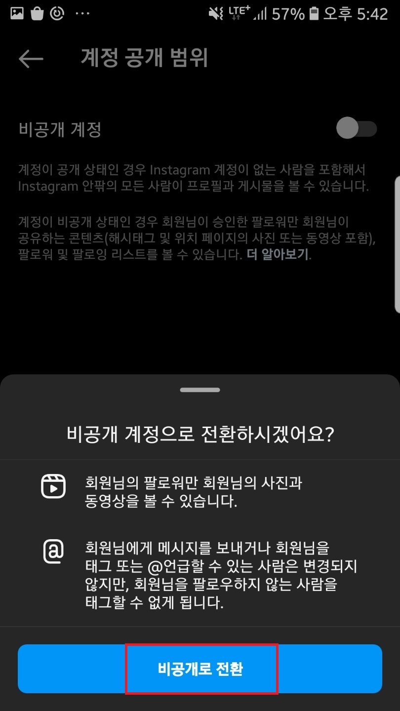 비공개 계정 버튼을 눌러주시고 비공개로 전환을 눌러주세요!