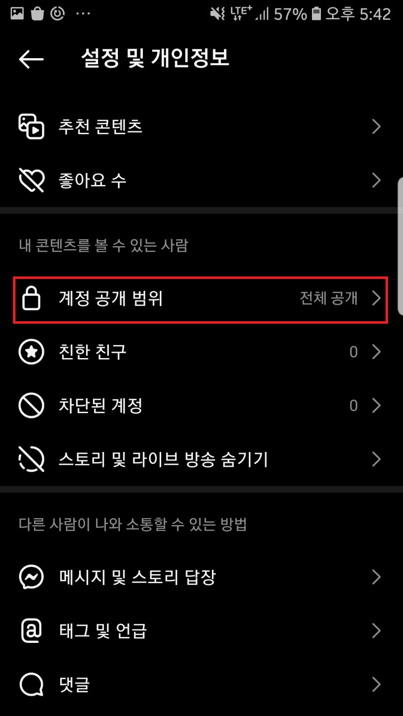 아래로 스크롤한 후 계정 공개 범위를 찾아 들어가주세요.
