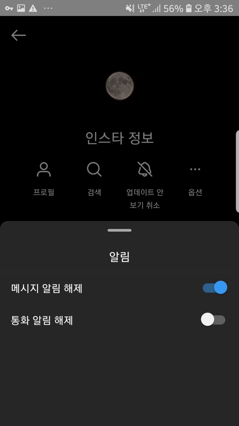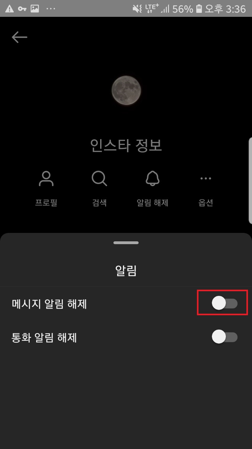 알림 해제를 누르고 메시지 알림 해제를 켜주면 이 계정의 알림만 안 받을 수 있어요.