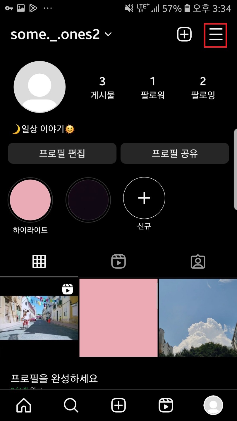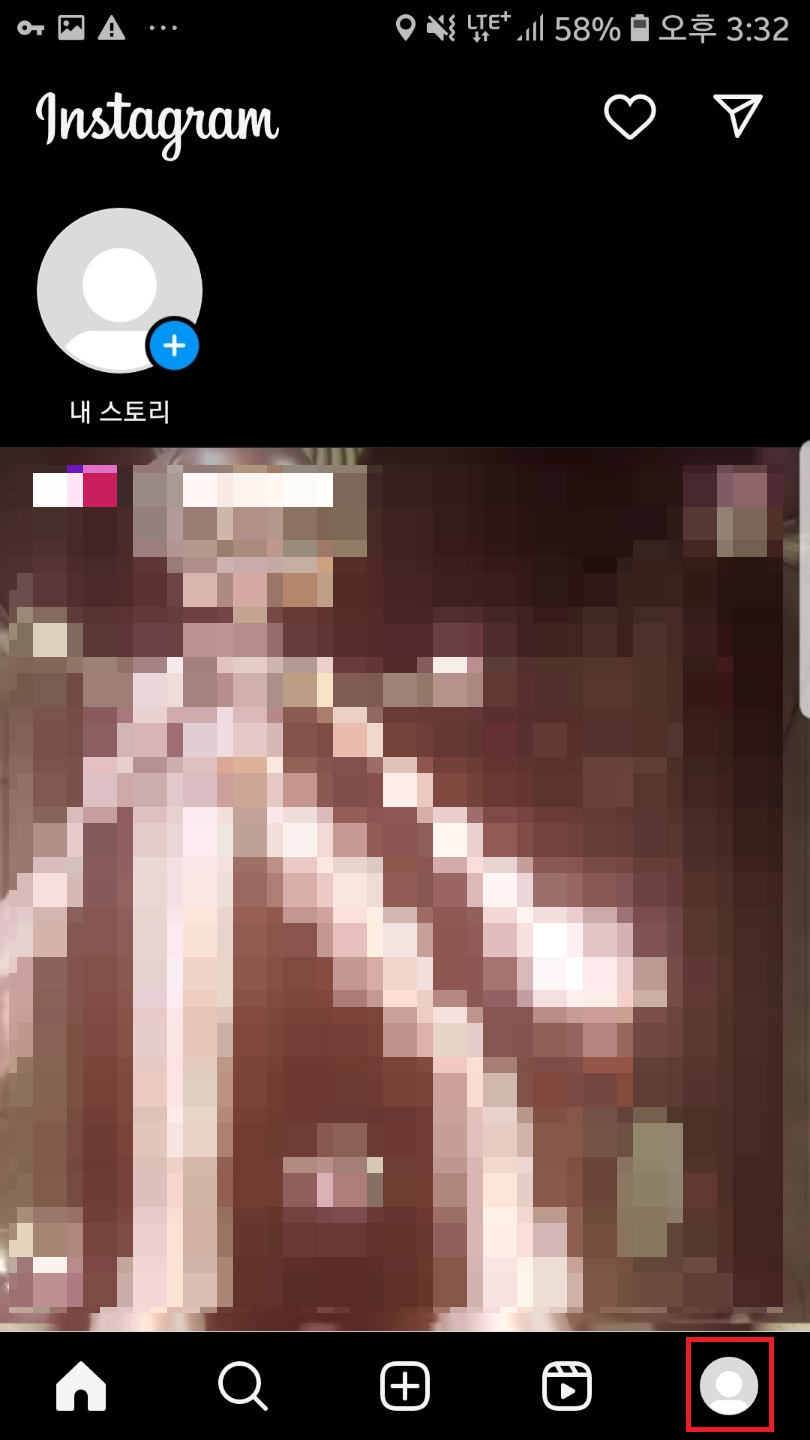 인스타 어플을 실행한 후 우측 하단 프로필을 클릭하여 내 피드에 들어가주세요.