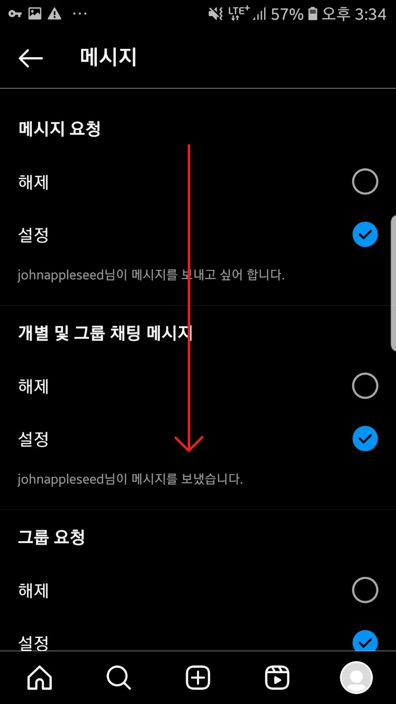 개별 및 그룹 채팅 메시지 탭에서 해제를 선택해주시면 디엠 메시지 알림이 모두 해제돼요!