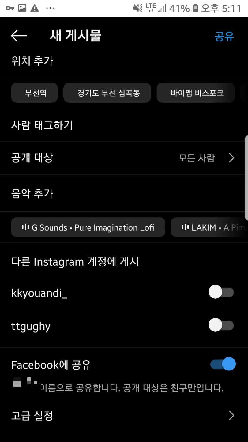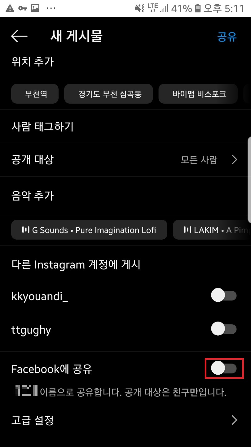 게시물 등록 메뉴 ▶ 아래로 스크롤 ▶Facebook에 공유 설정