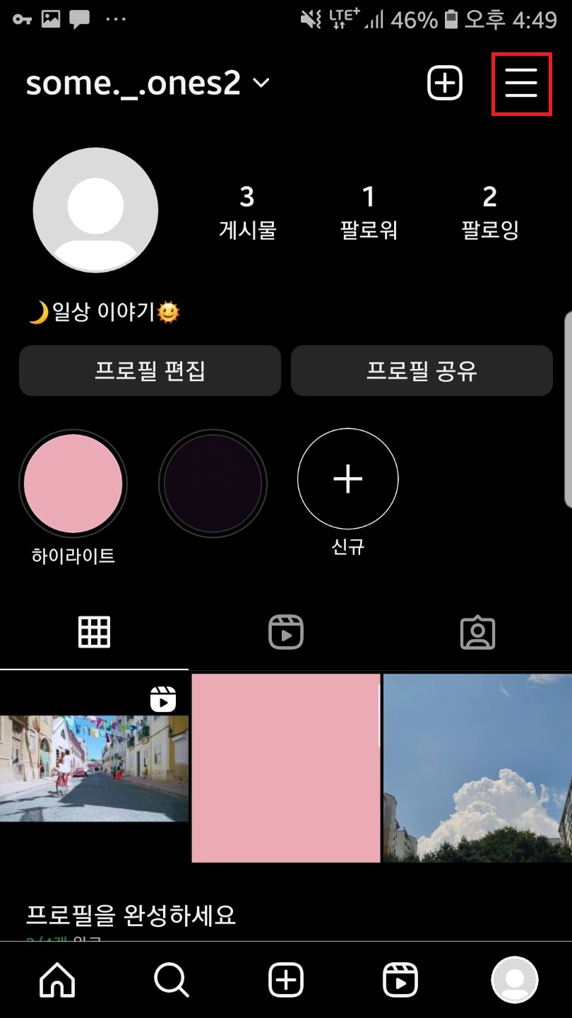인스타 어플을 실행하시고 우측 하단 프로필을 클릭하여 내 피드에 들어가주세요.