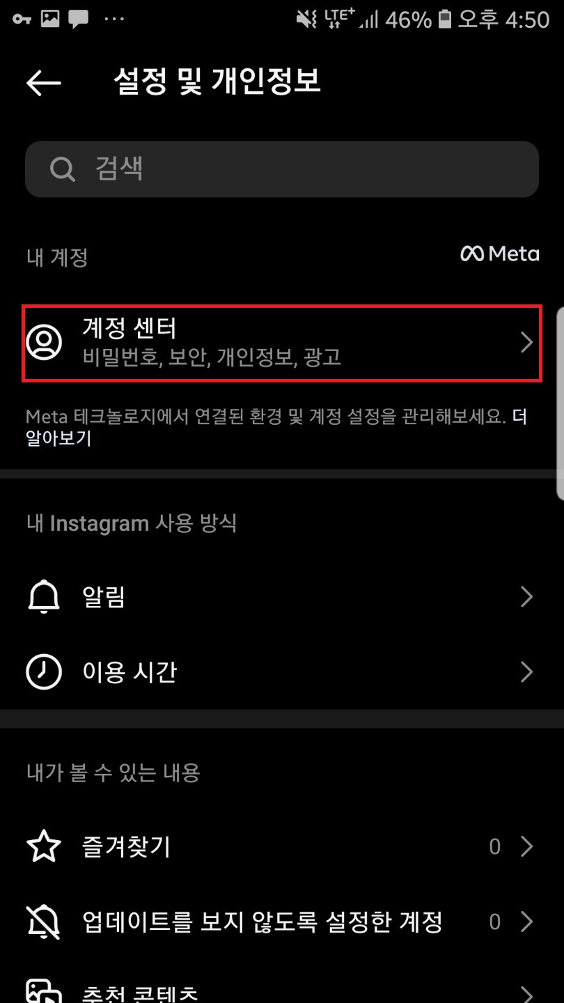 계정 센터 ▶ 아래로 스크롤 ▶계정