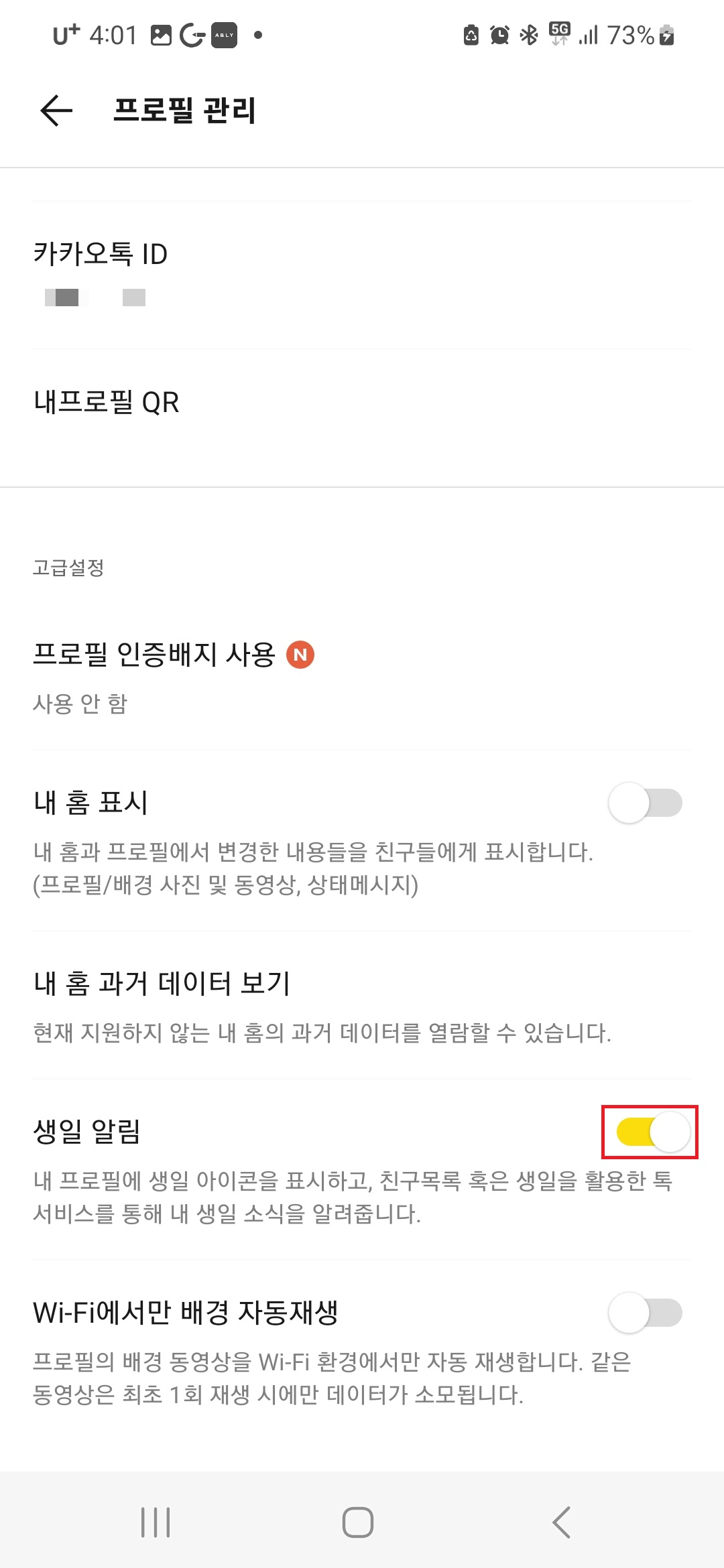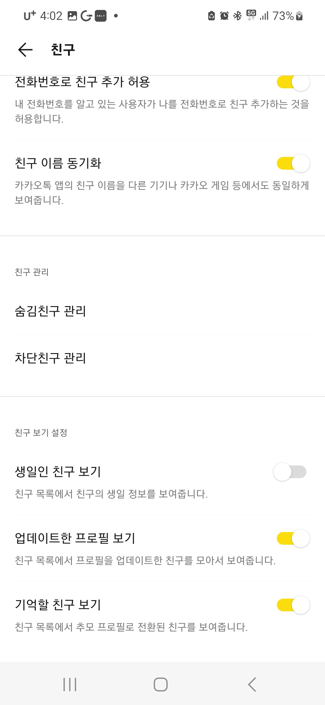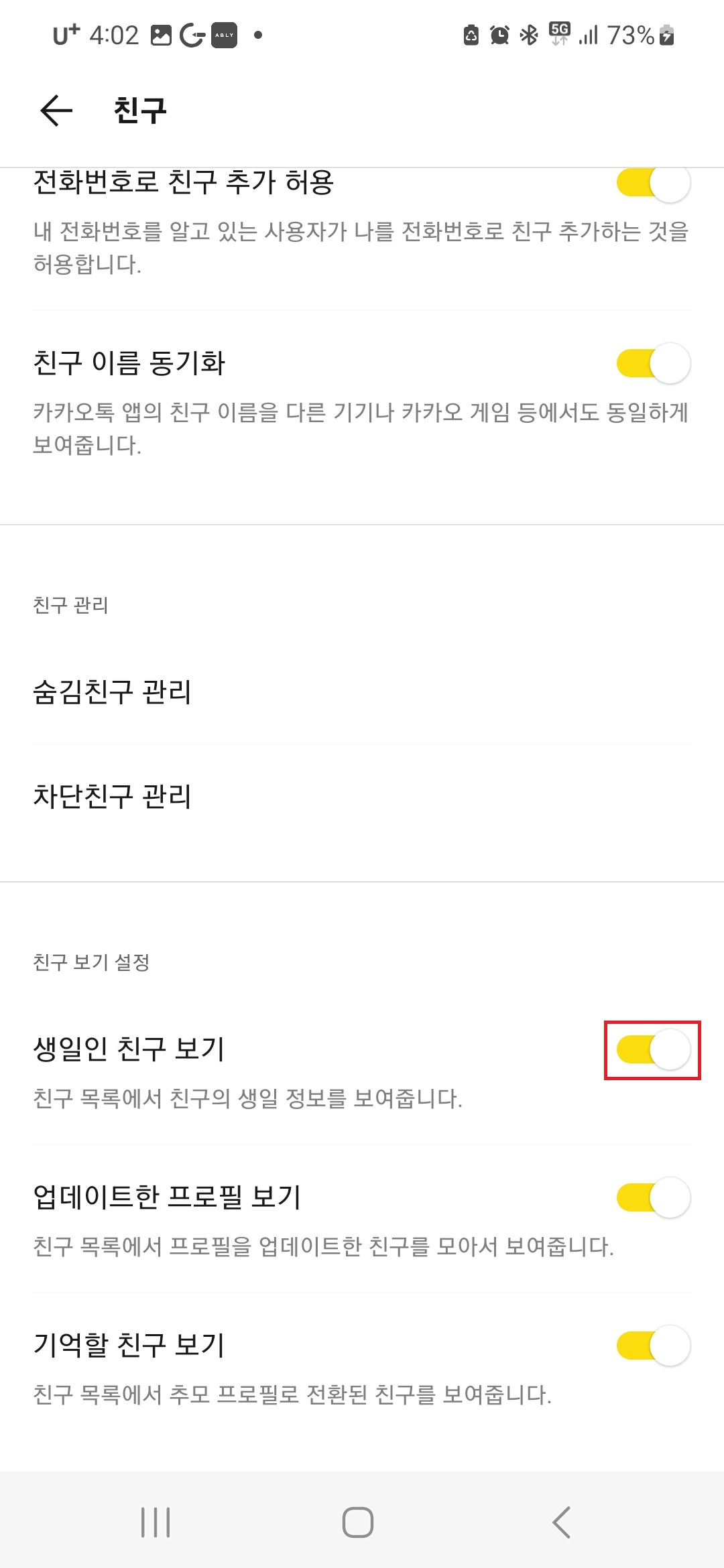 생일인 친구 보기 스위치를 OFF로 돌려 해제하면 내 화면에 생일인 친구도 뜨지 않아요!