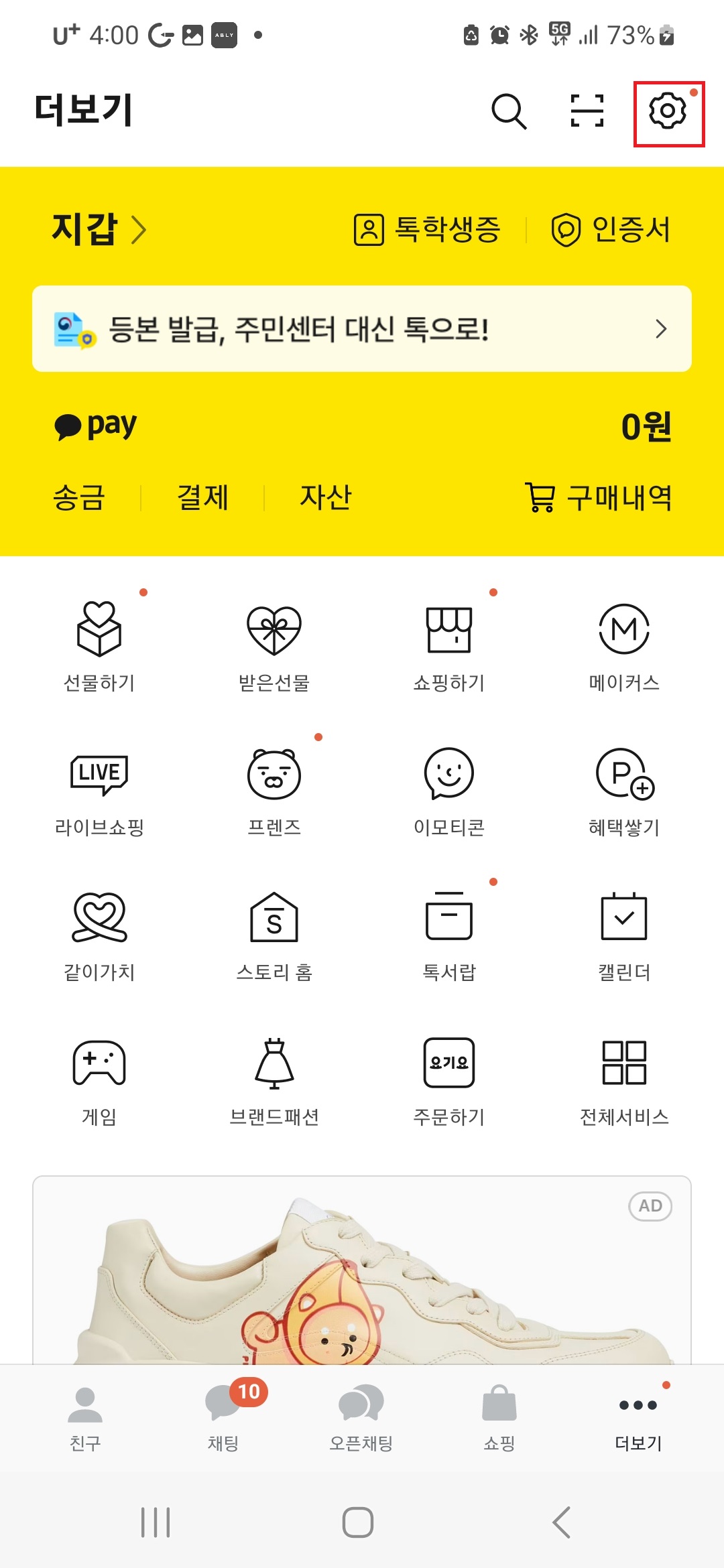 하단 메뉴 중 맨 우측 더보기를 눌러주신 후 우측상단 톱니바퀴 아이콘을 클릭하여 설정을 열어주세요.