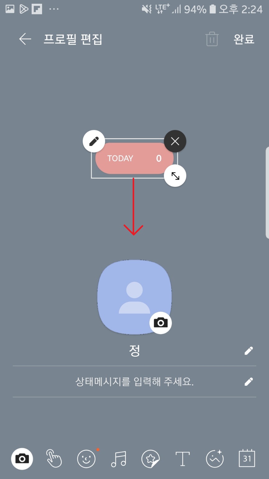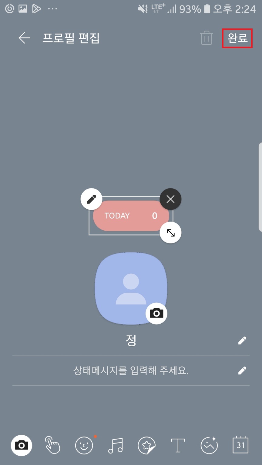 투데이 위젯을 누른 상태로 원하는 위치에 드래그 해준 후 상단 완료를 눌러주세요.