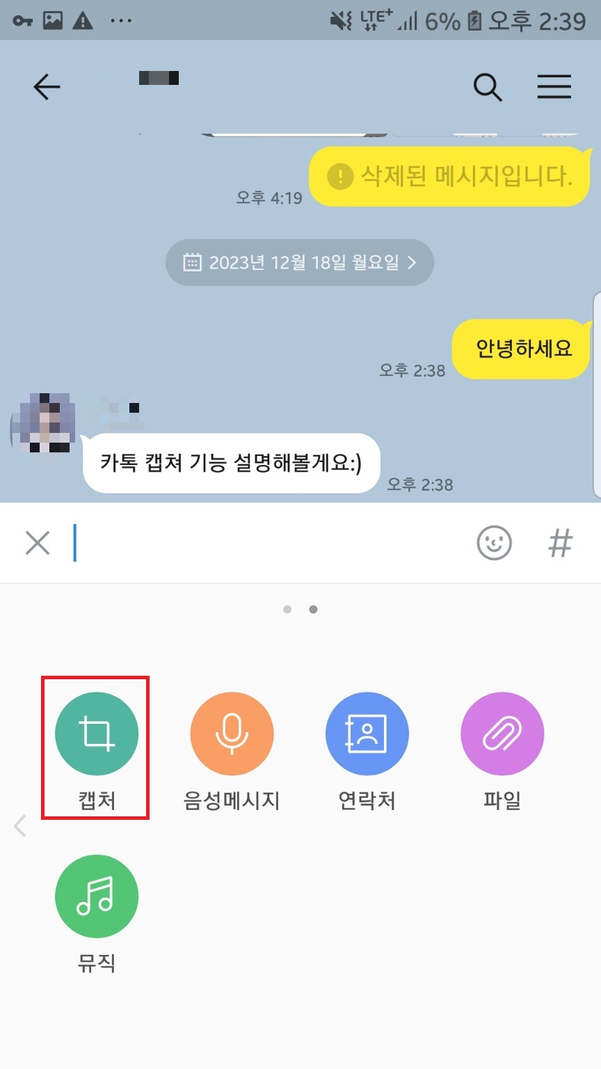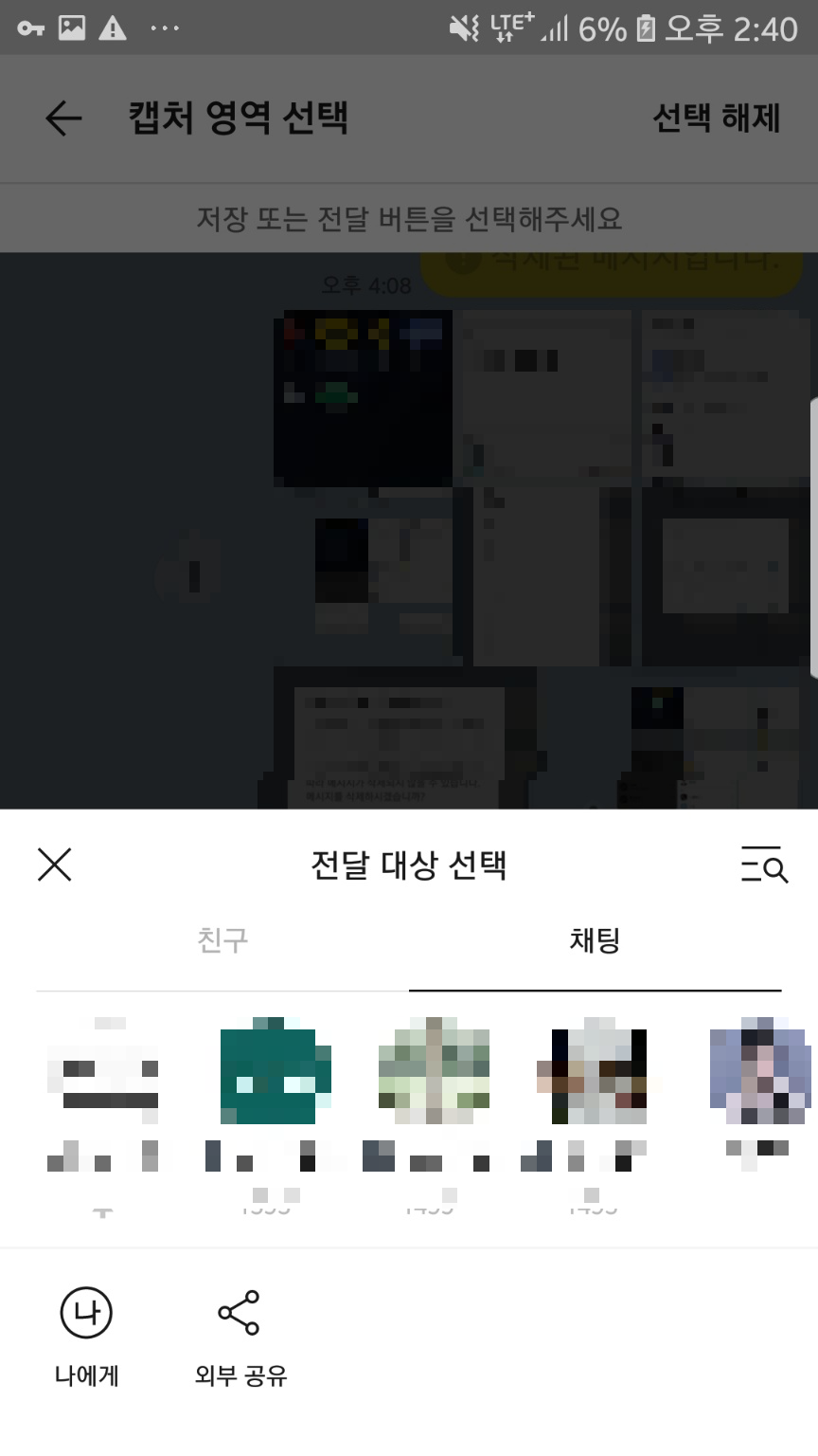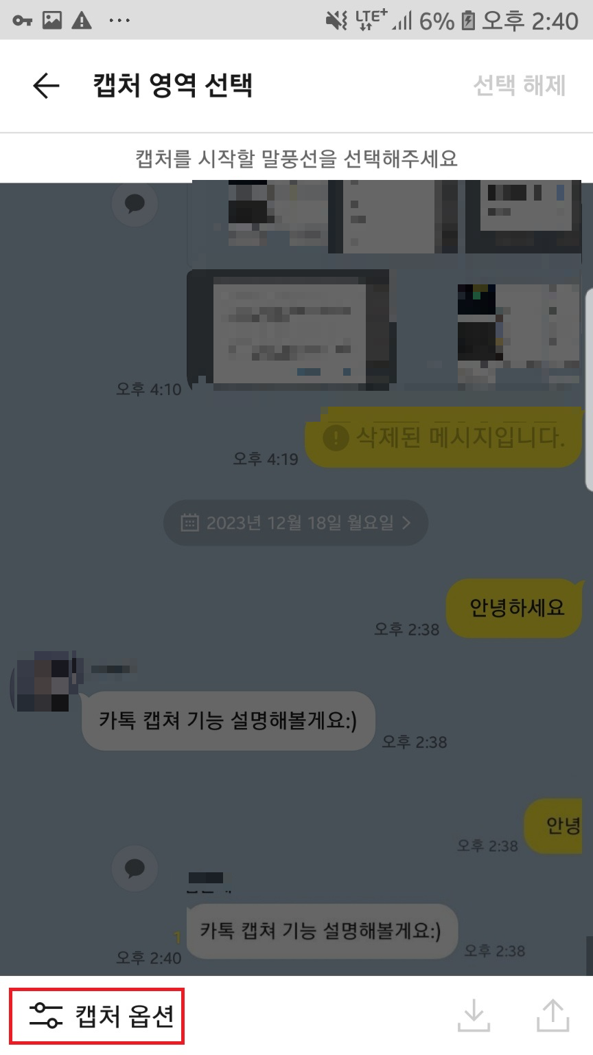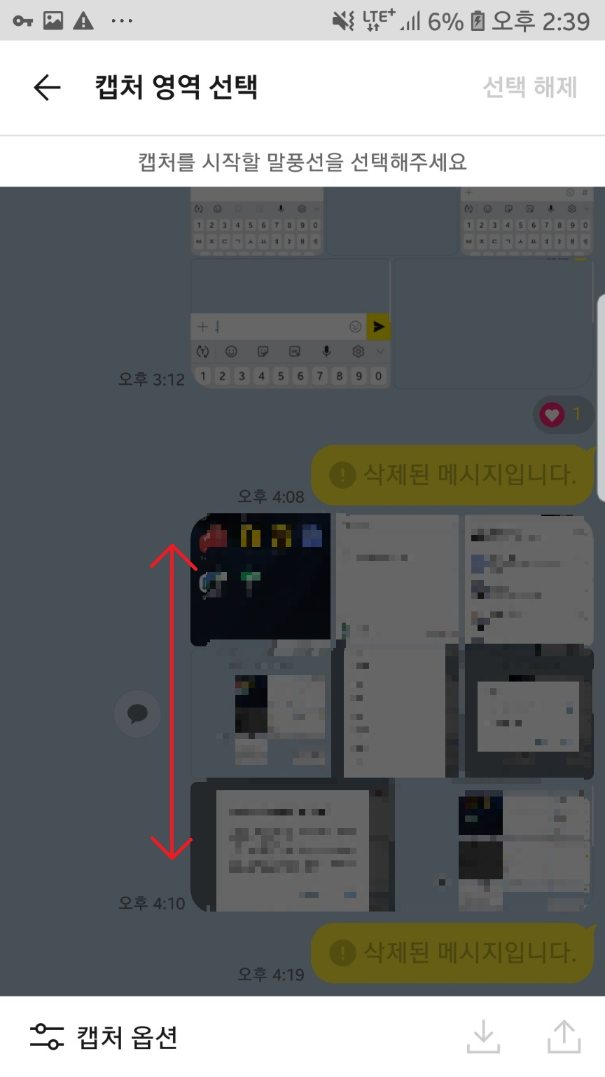 캡처를 클릭해주시고 아래 위로 스크롤하여 캡쳐할 메시지를 찾아주세요.