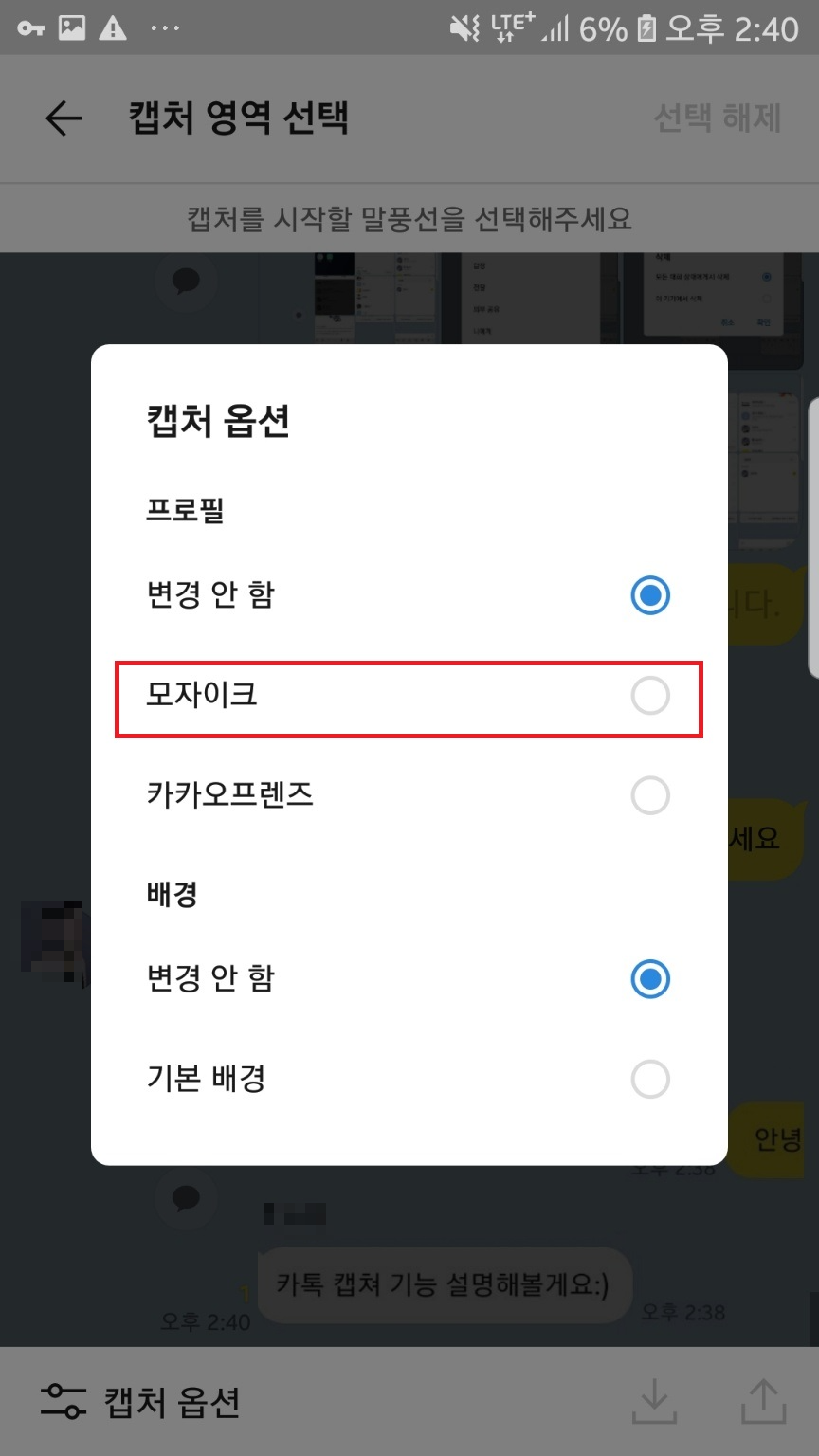 캡처 옵션을 클릭하고 모자이크를 눌러주면 자동으로 프사가 모자이크 되고, 이름도 바뀌어요!