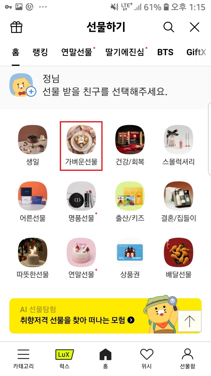 선물하기에 들어가서 카테고리를 선택하여 들어가주세요.