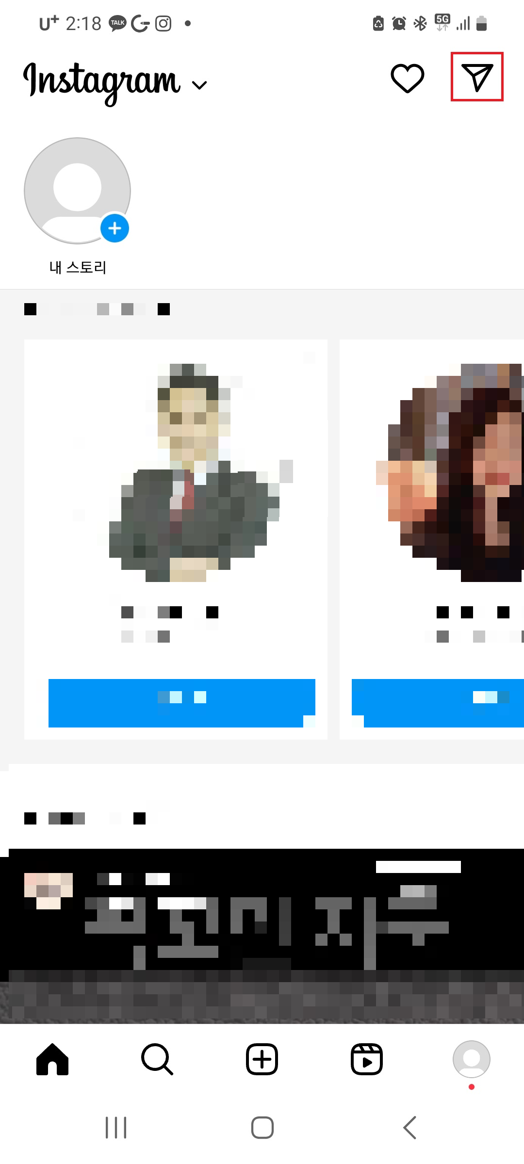 인스타 어플 실행▶우측 상단 종이비행기 아이콘