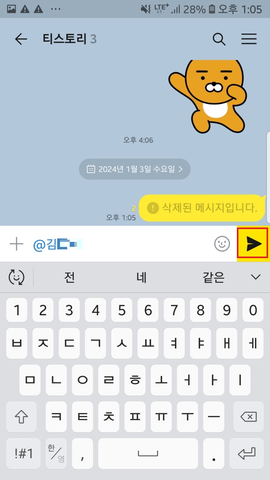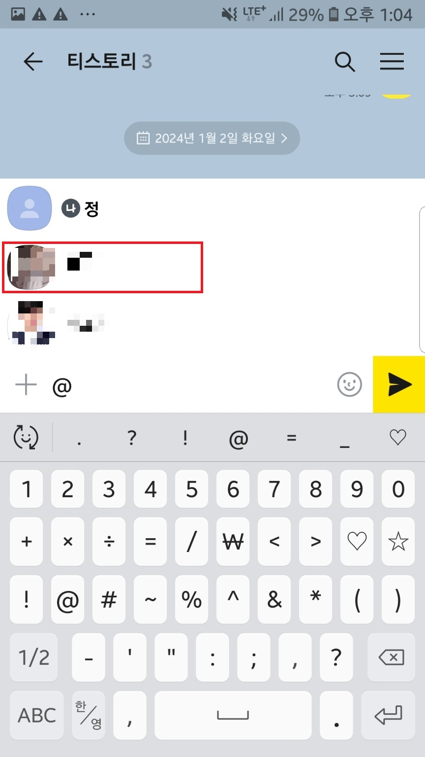 입력창 위에 뜨는 사람 중 멘션하고 싶은 사람을 선택하면 파란글씨로 이름이 입력되는데요. 이걸 보내주시면 된답니다.