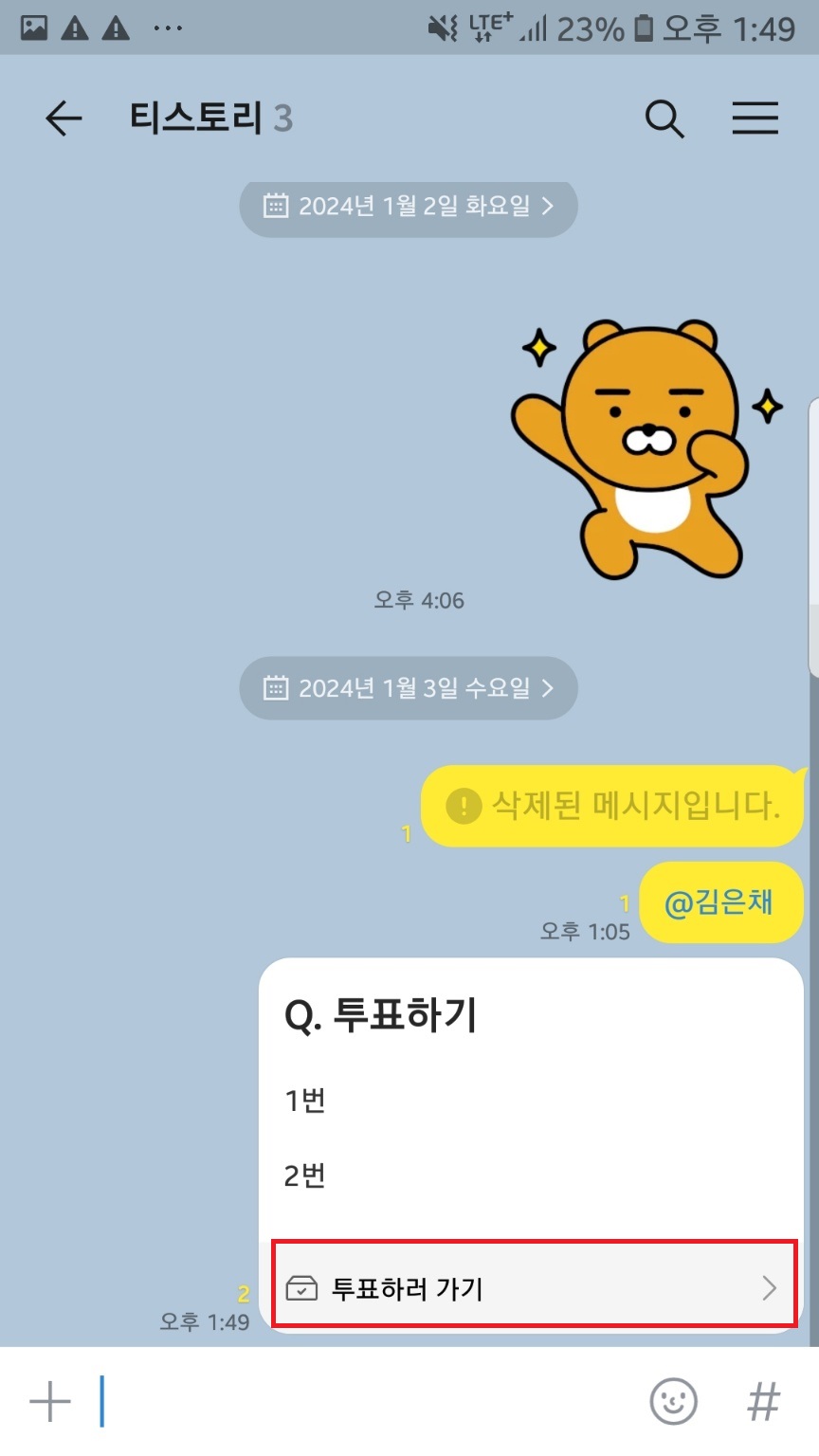 상단 완료를 눌러주면 채팅방에 투표가 보내지는데요. 여기서 투표하러 가기를 눌러주세요.
