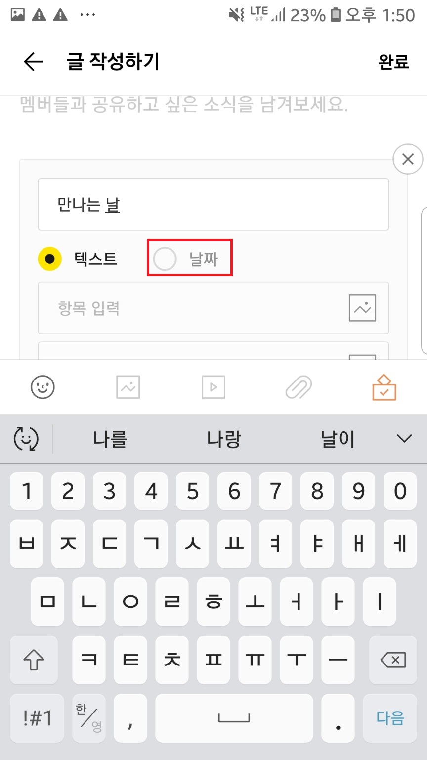만약 약속 날짜를 정하고 있다면, 텍스트 옆 날짜를 체크해서 날짜 선택을 클릭해보세요.