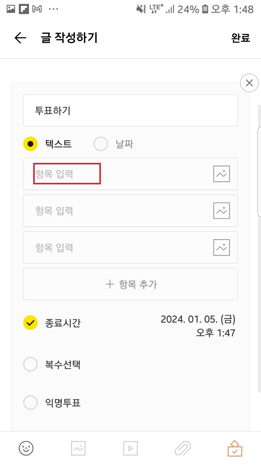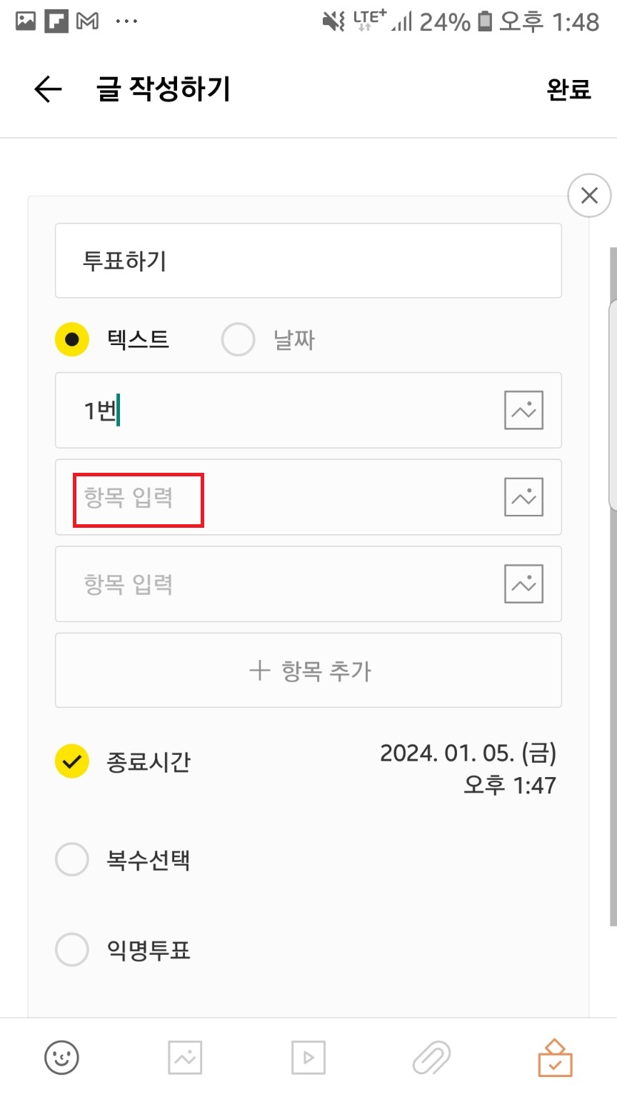 투표 제목을 입력한 후 밑에 항목 입력을 클릭해 2개 이상 작성해주세요.
