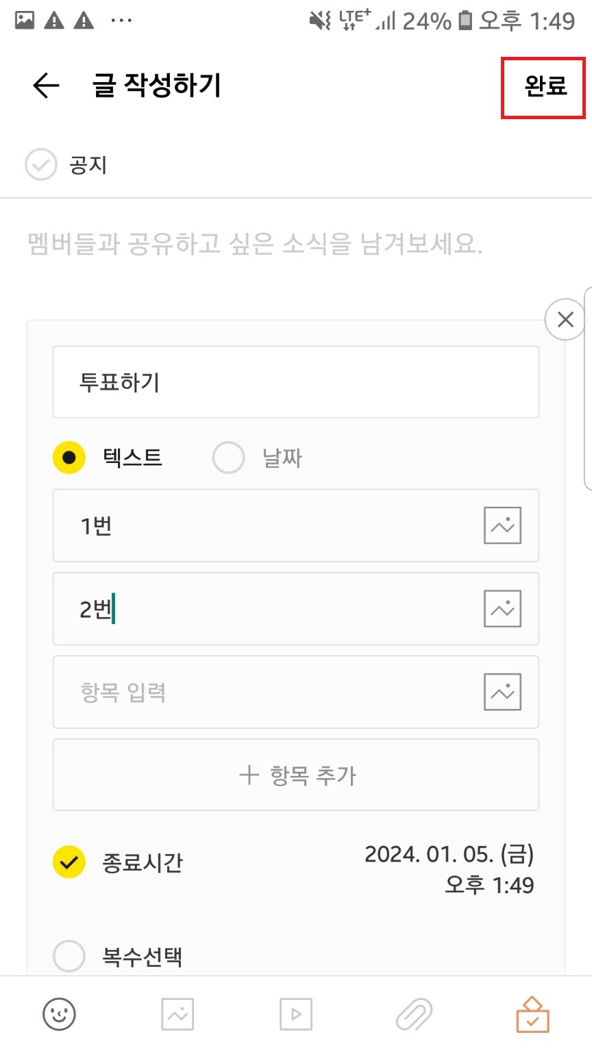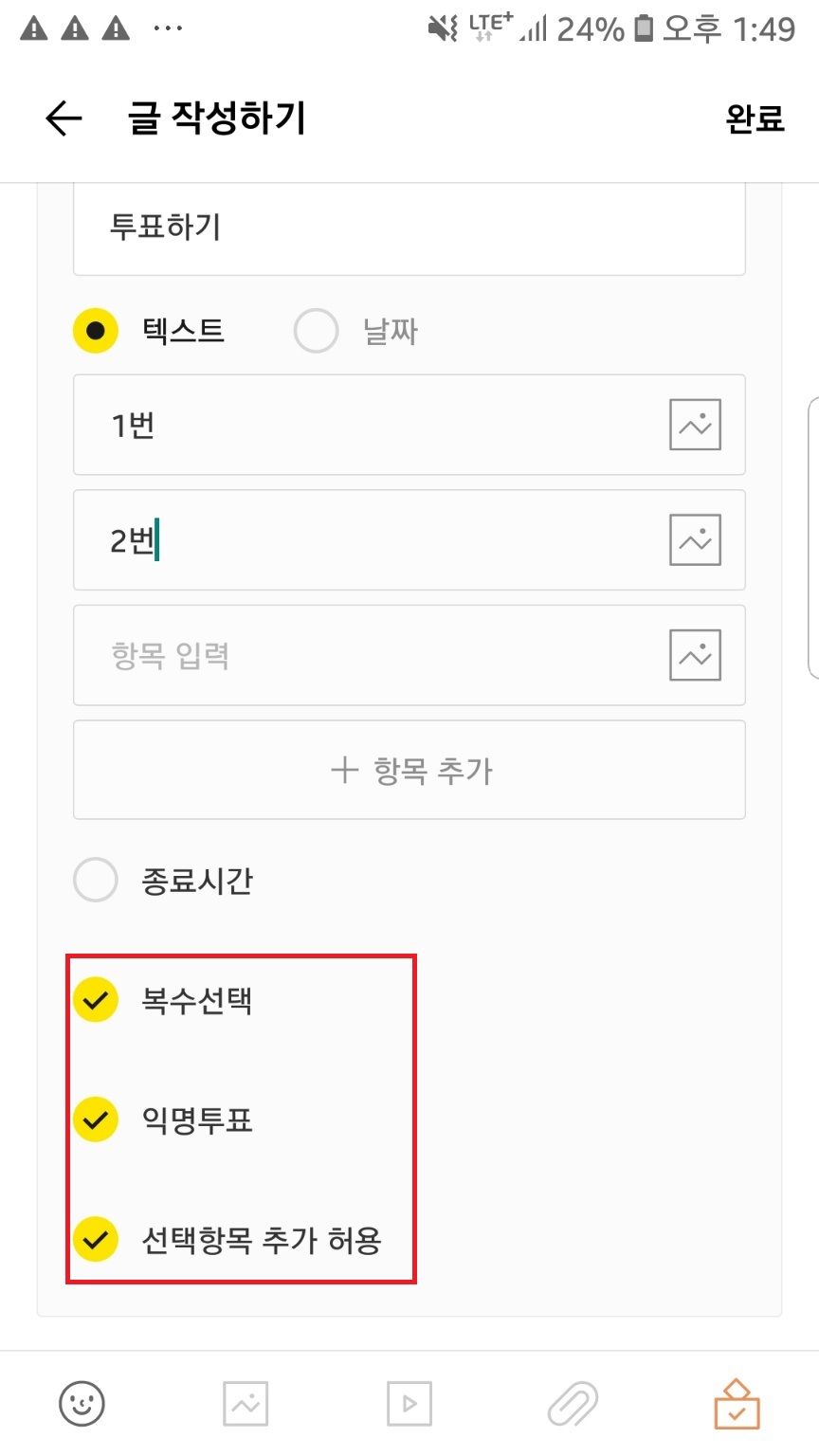 복수 선택은 한 사람이 여러 개 투표해도 된다고 허용하는 거고, 익명투표는 이름을 가린 상태로 투표하는 거, 선택항목 추가 허용은 처음 만든 항목 외에 다른 항목을 다른 사람이 추가하도록 허용하는 거예요. 이 중 원하는 옵션을 선택하여 체크해주시면 돼요!