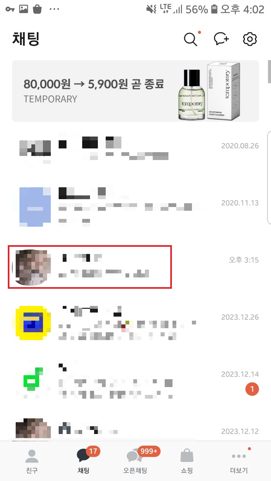 채팅 탭으로 들어가 채팅방을 클릭해 들어가주세요.