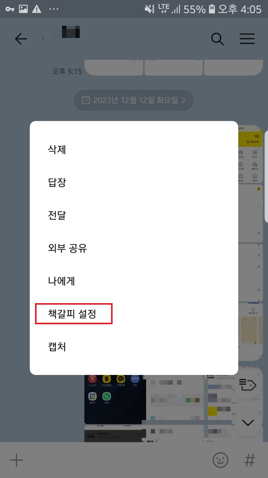 메세지를 길게 눌러준 후 책갈피 설정을 클릭해주세요.