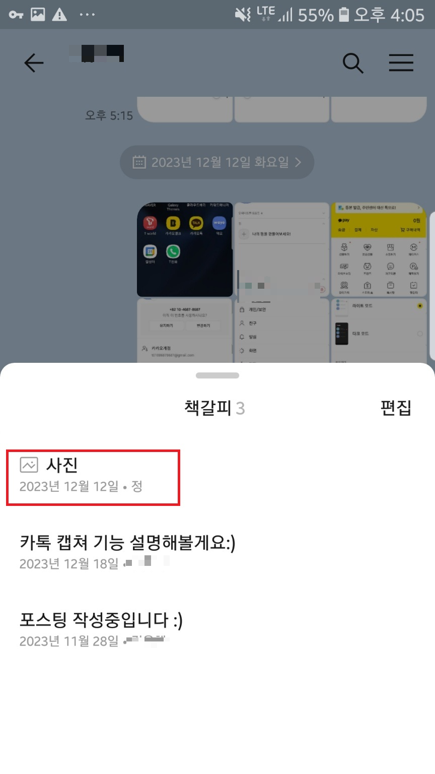 사진도 메세지와 똑같은 방법으로 책갈피 설정을 할 수 있어요!