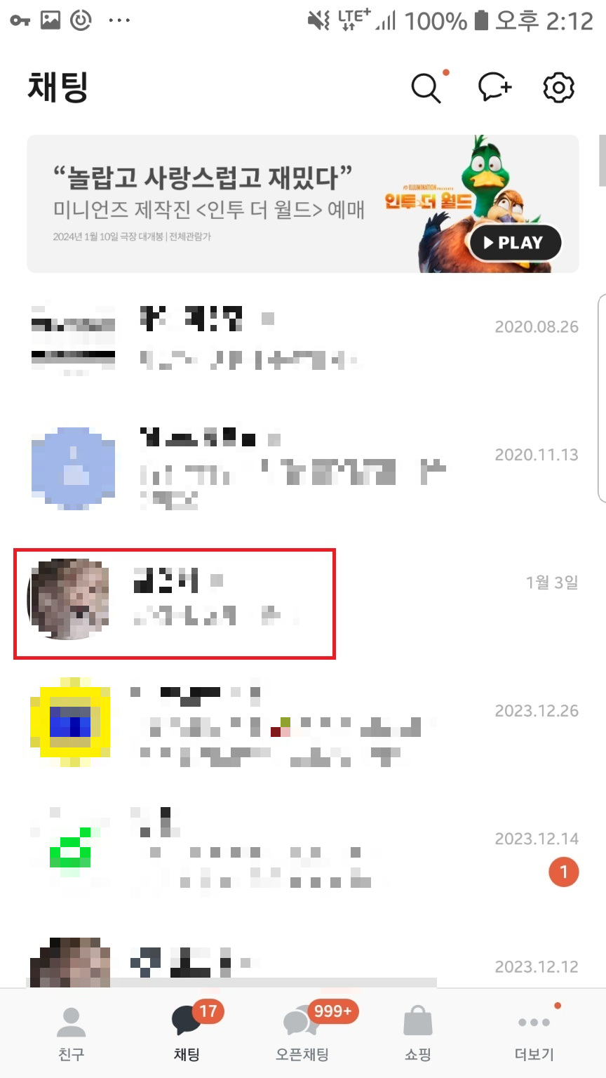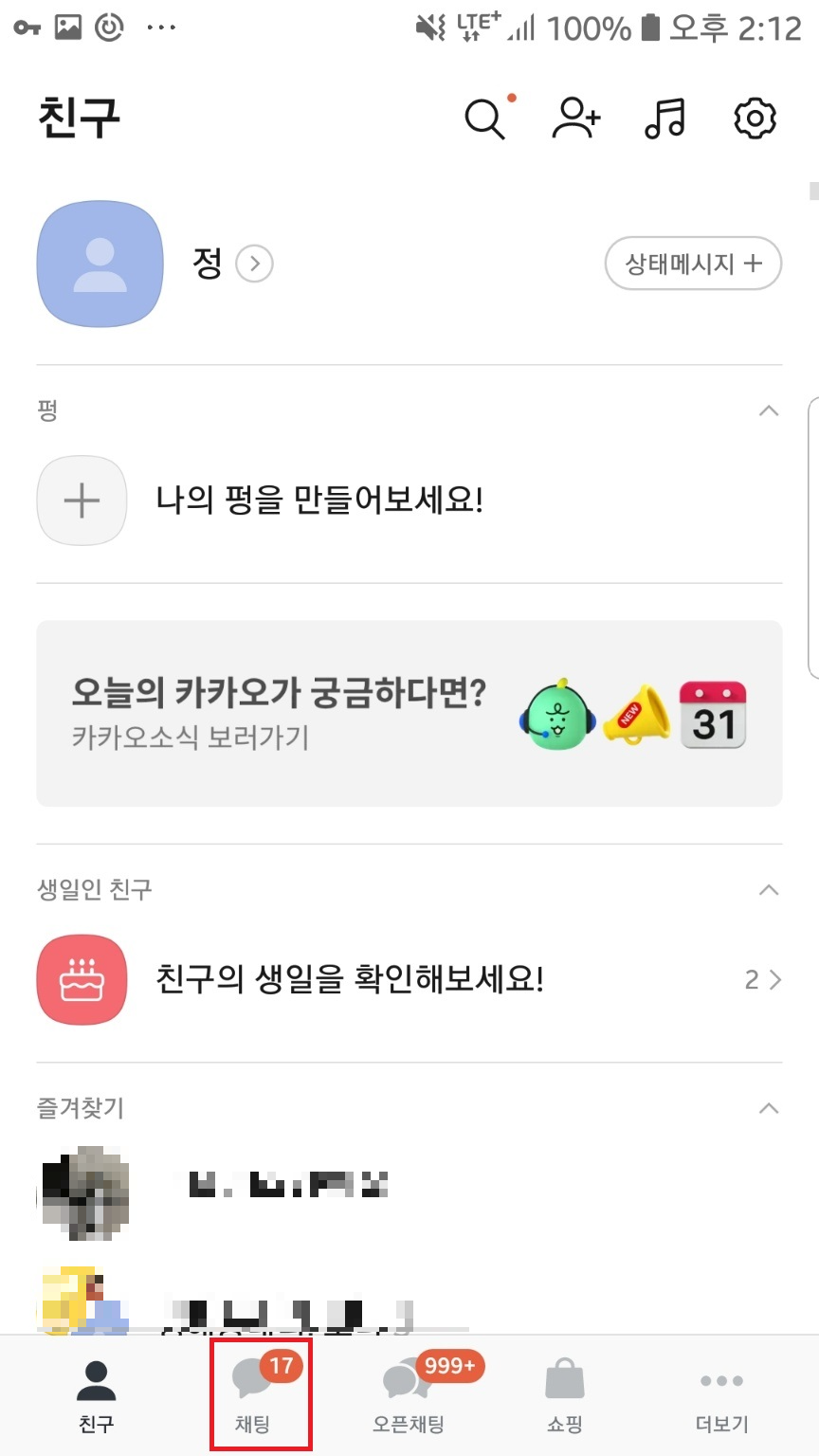 카톡을 실행해주시고 아래 메뉴 중 채팅 탭에 들어가주세요.