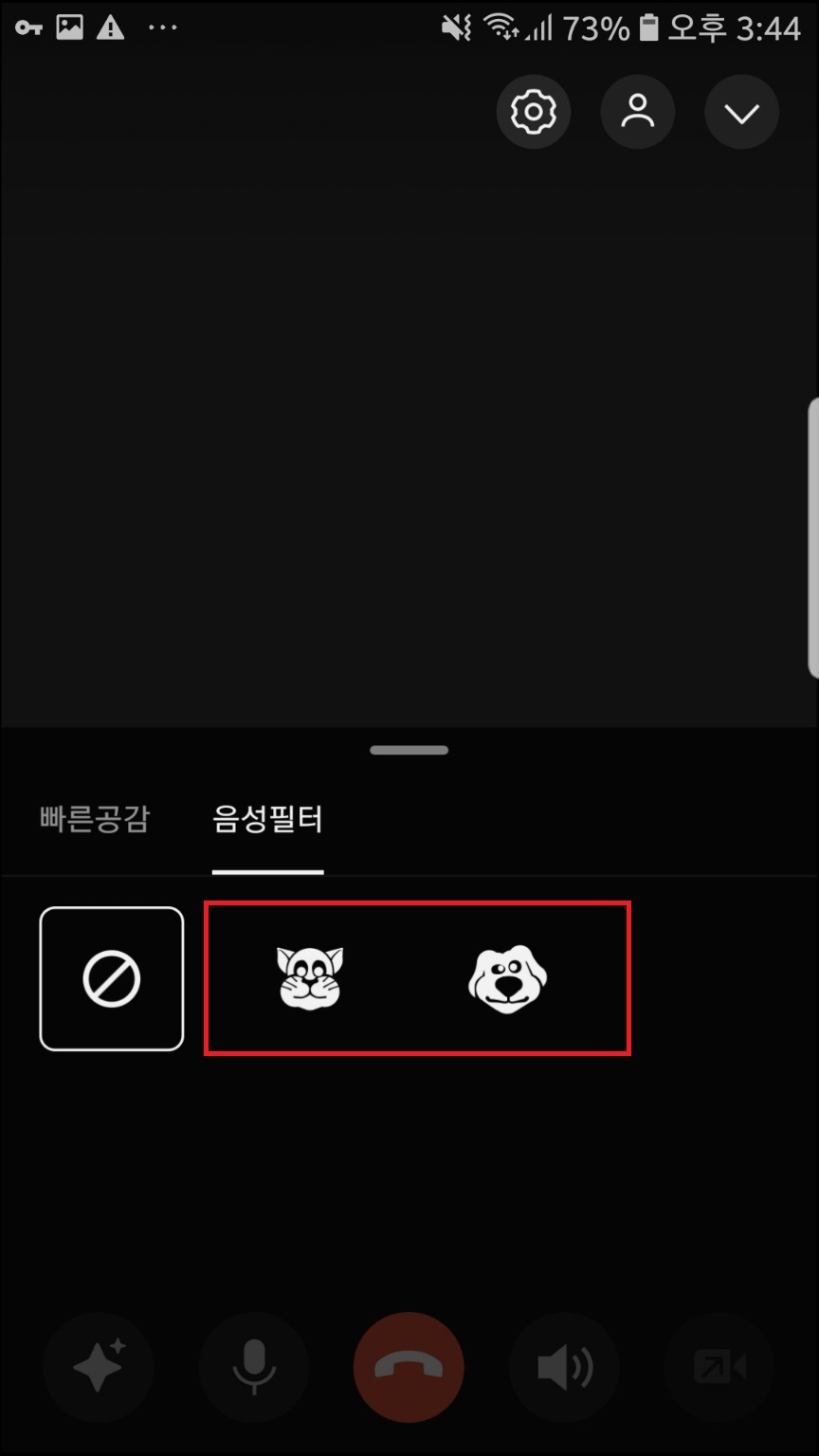 음성필터를 누른 후 고양이, 강아지 중 필터를 선택해주세요. 고양이는 높은 목소리, 강아지는 낮은 목소리로 필터가 씌워진답니다.
