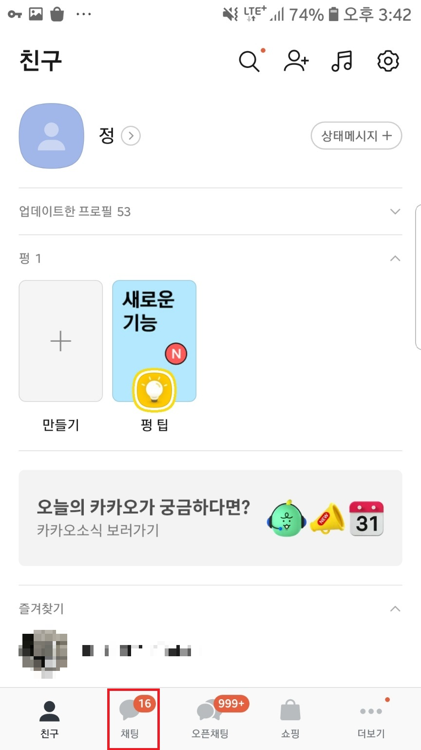 카톡 앱을 실행한 후 채팅 탭에 들어가주세요.
