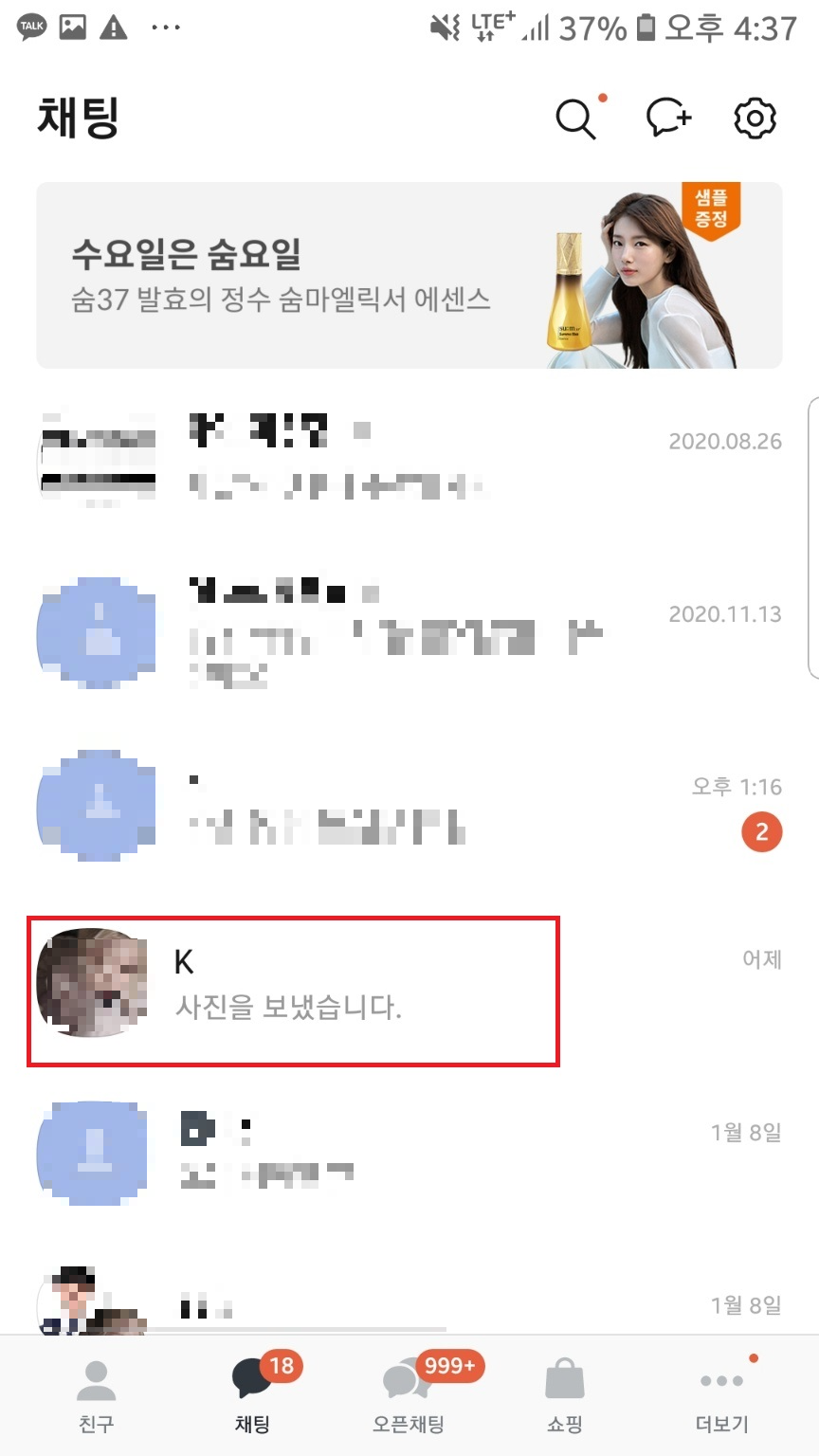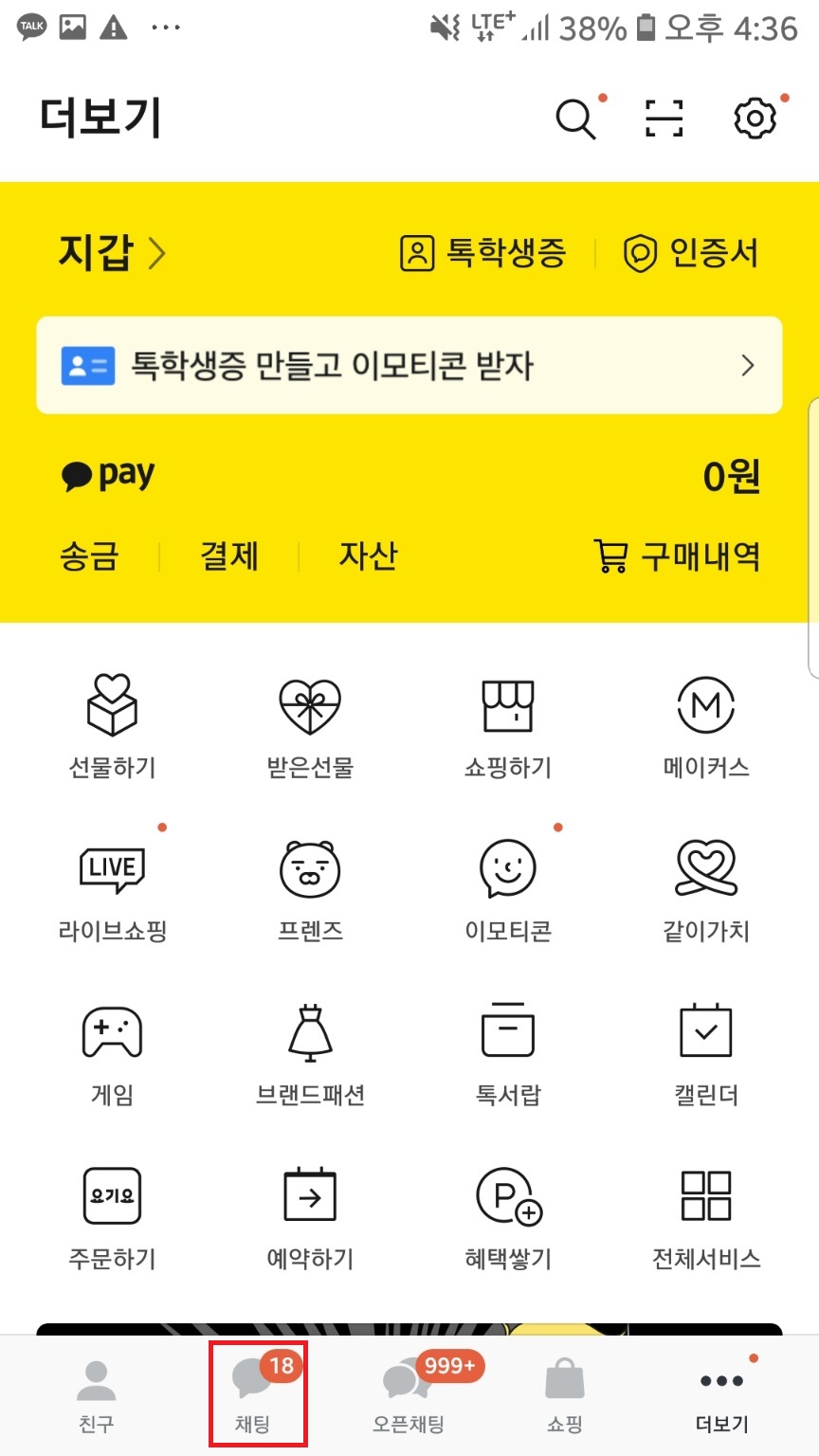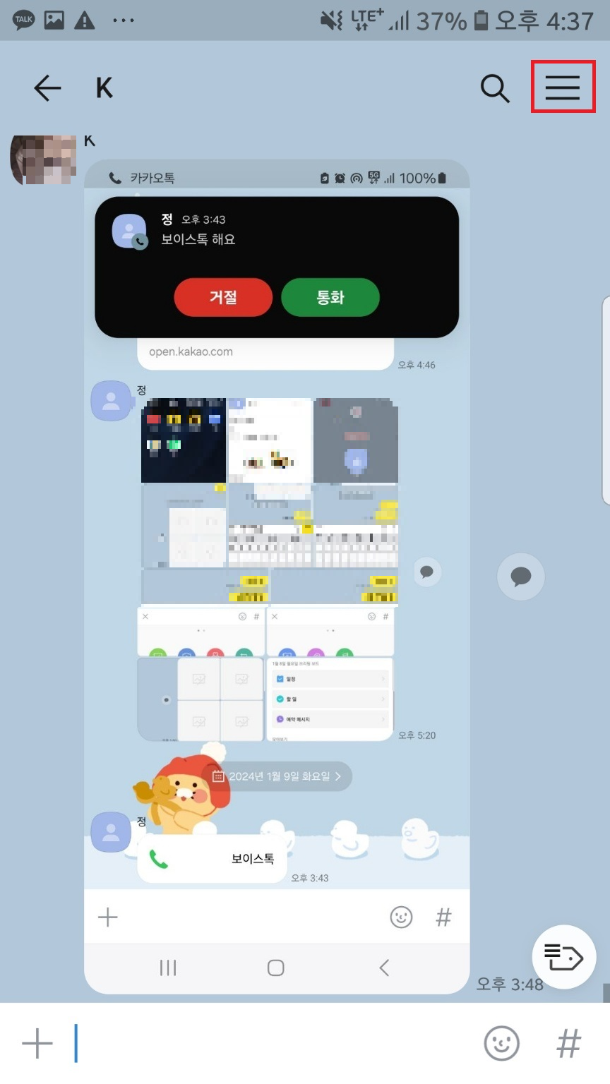 채팅 ▶채팅방 선택 ▶상단 선 세개