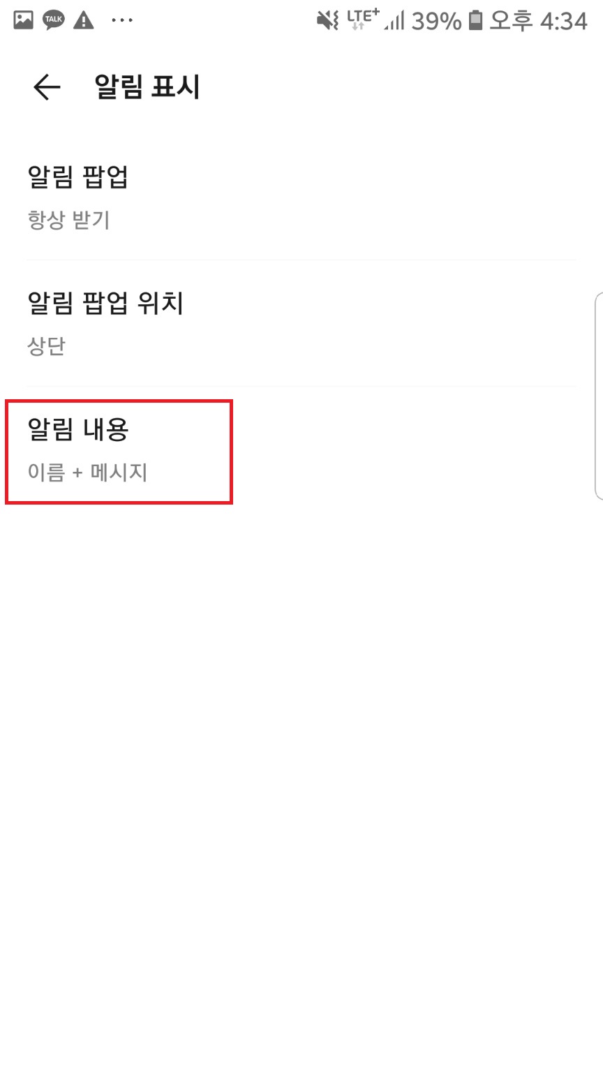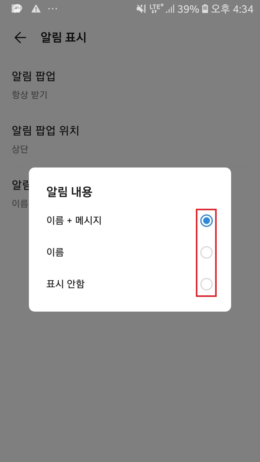 알림 내용에 들어가서 알림을 어떻게 표시할지도 정할 수 있어요. 이름+메시지, 이름, 표시 안함 중에 선택할 수 있답니다.