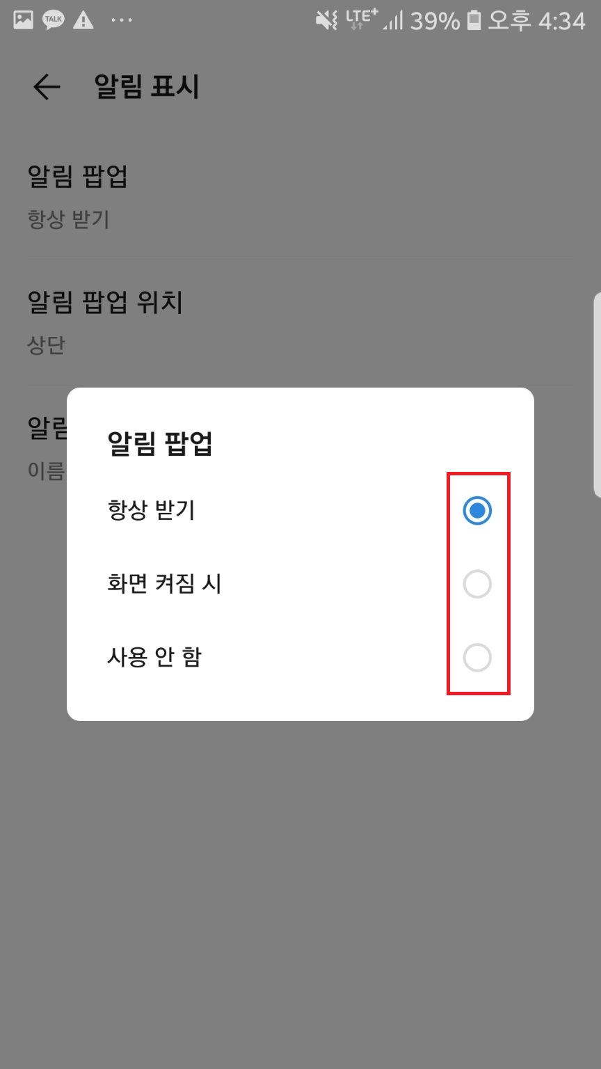 알림 표시를 누른 후 알림 팝업에 들어가면 항상 받기, 화면 켜짐 시 , 사용 안 함 3가지 중 선택할 수 있어요.
