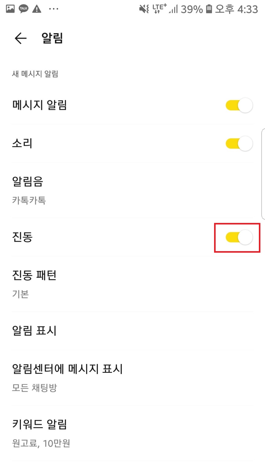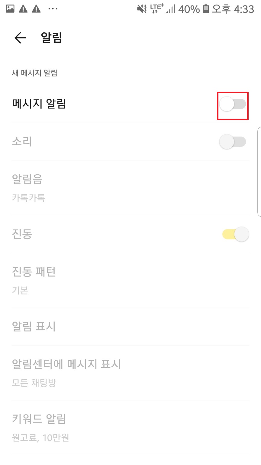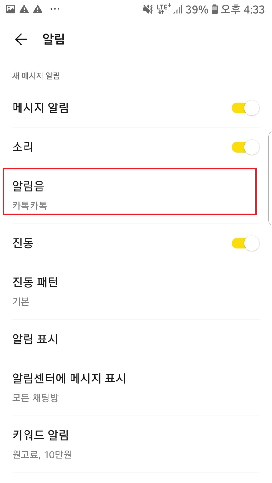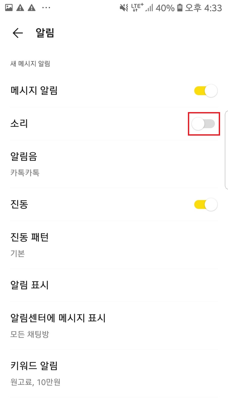 알림에 들어가서 메시지 알림을 켜거나 끌 수 있어요. 저는 켠 후에 소리까지 켜줄게요.