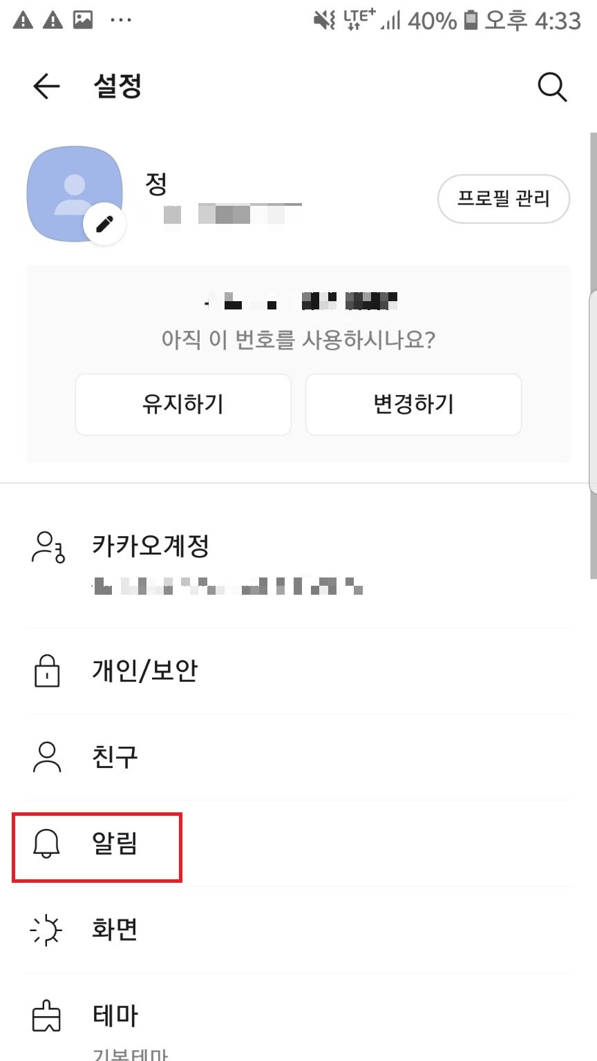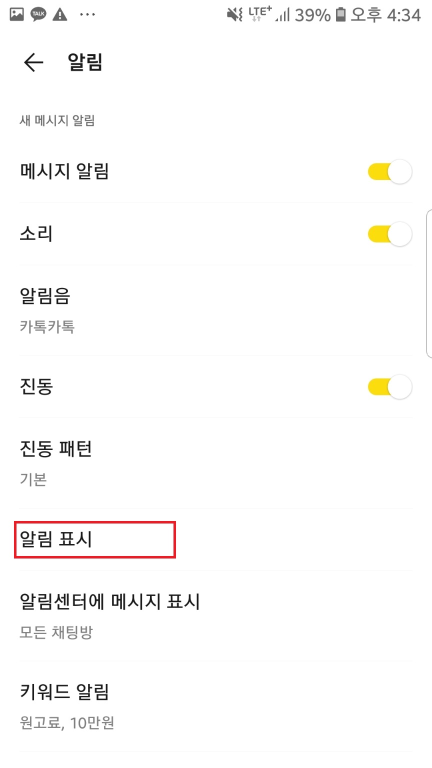 카톡 메시지 알림 내용, 숫자표시 설정하기