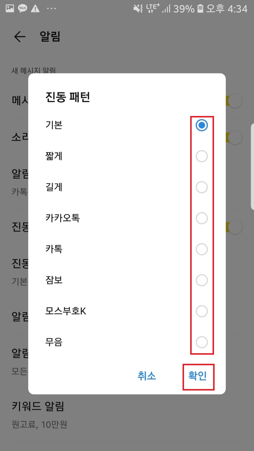 진동을 켜거나 끌 수도 있구요, 이 기능을 켰을 경우 진동 패턴도 지정할 수 있어요. 진정 패턴에 들어가 하나를 선택하고 확인을 눌러주세요. 마찬가지로 선택하면 한 번씩 진동을 느낄 수 있어요.