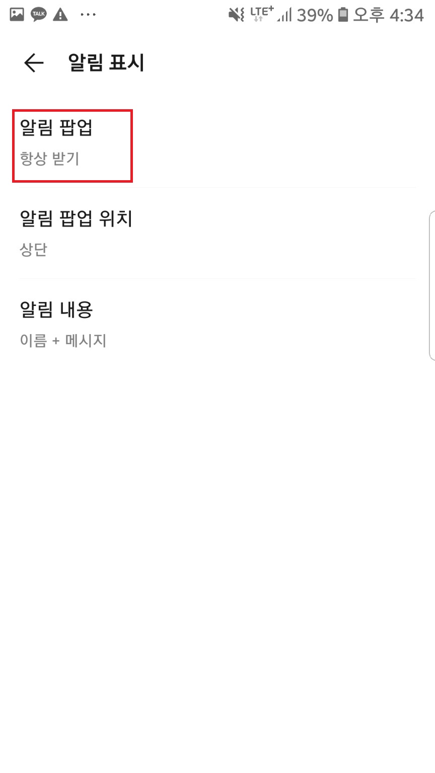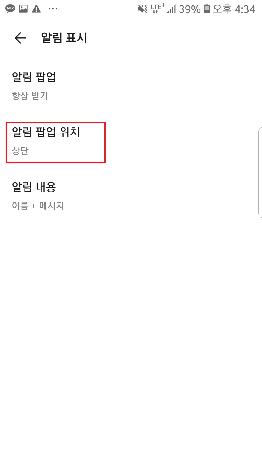 알림 팝업 위치를 클릭한 후 상단과 가운데 중 선택할 수 있어요. 알림이 왔을 때 핸드폰에 표시될 위치를 말하는 거랍니다:)