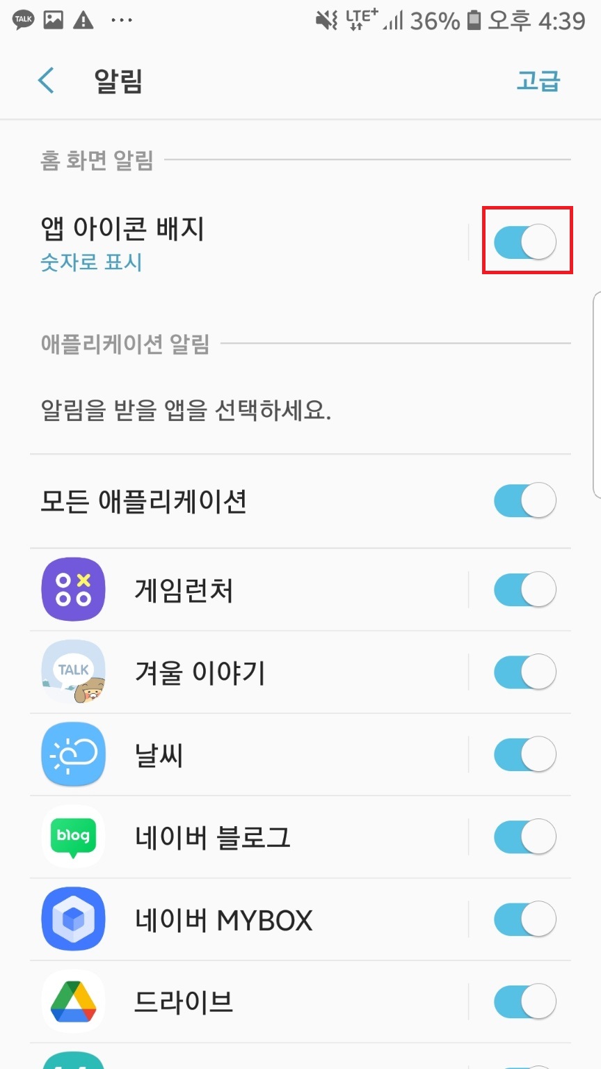 설정 ▶알림 ▶앱 아이콘 배지 해제