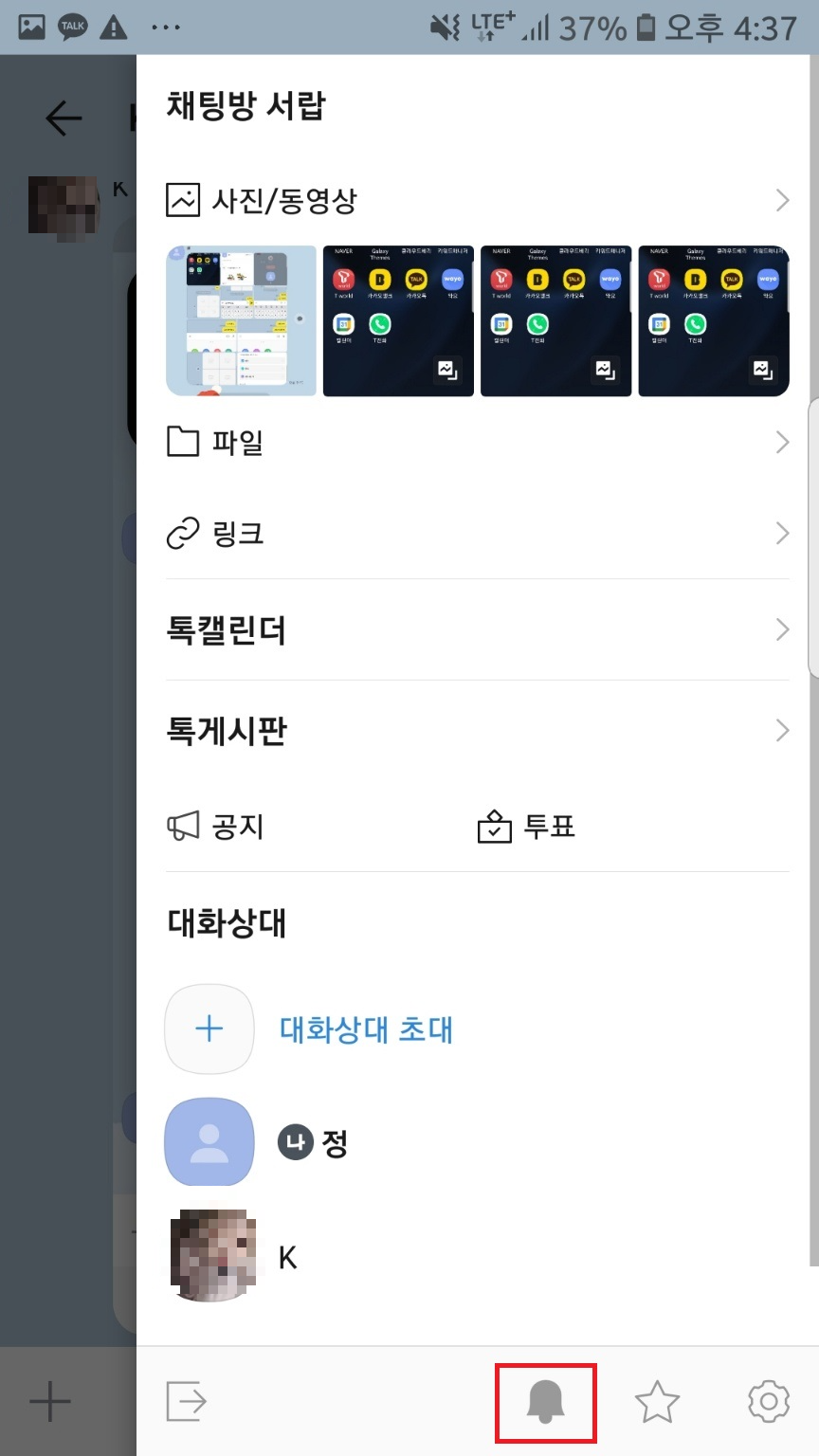 하단에 보이는 종 아이콘을 클릭해주시면 채팅방 알림이 해제돼요! 한 번 더 누르면 다시 켜진답니다.
