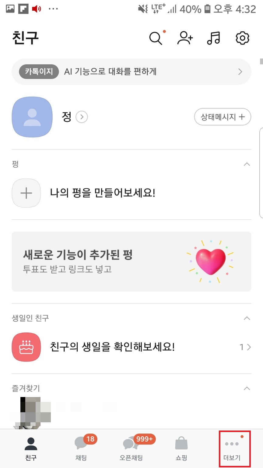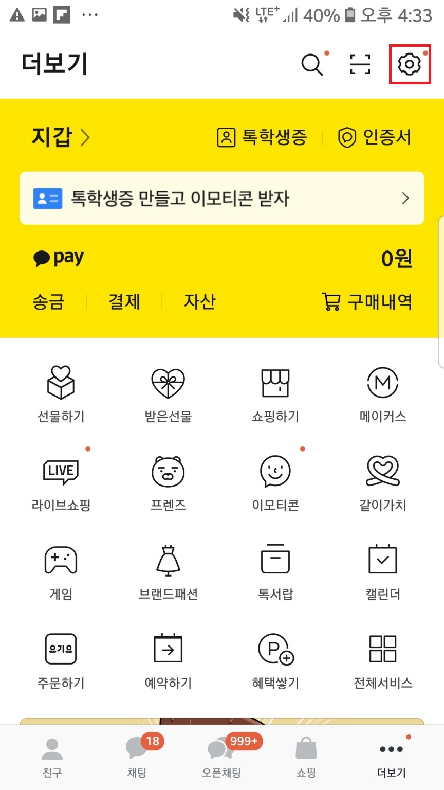 카톡 실행▶더보기 ▶톱니바퀴 아이콘