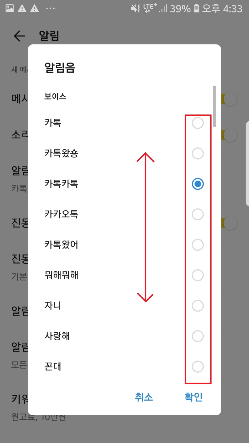 알림음에 들어가 위아래로 스크롤하여 알림음을 선택하신 후 확인을 누르면 적용돼요. 눌러보시면 한 번씩 소리가 재생된답니다!